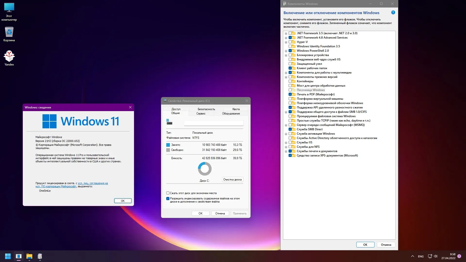 Операционная система построена на оригинальной сборке 22000.652, что гарантирует стабильность и совместимость с современным программным обеспечением. В системе отключена телеметрия, удалены компоненты, связанные с отчетностью и слежением, включая UnifiedTelemetryClient и WindowsErrorReporting. Поиск в системе функционирует, хотя его значок скрыт из интерфейса для минимализма. Это позволяет сократить нагрузку на процессор и память, особенно на слабых конфигурациях.