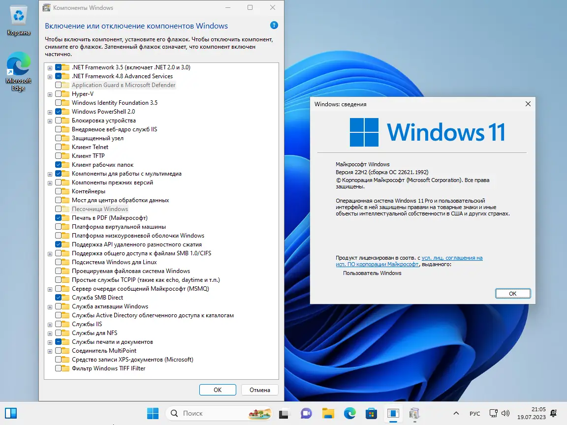 - Активирован компонент .NetFramework 3.5, включающий в себя поддержку более ранних версий 2.0 и 3.0, что расширяет совместимость с устаревшим программным обеспечением.
