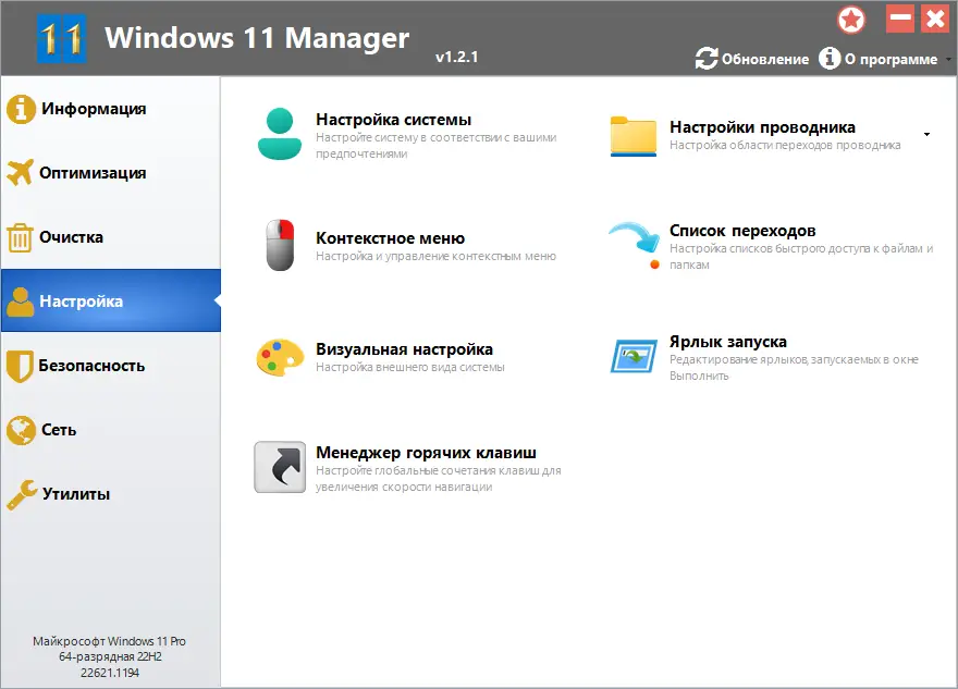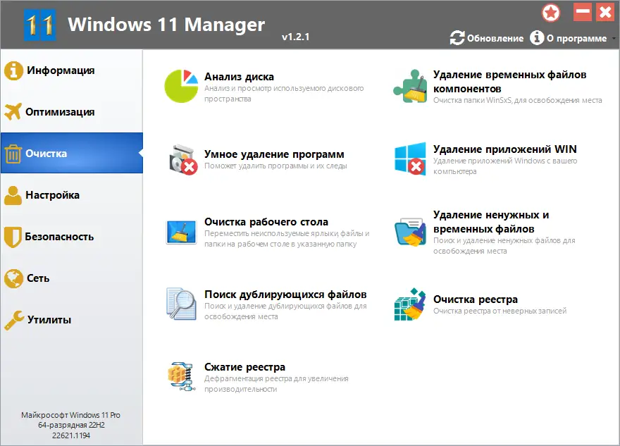 Windows 11 Manager — многофункциональная утилита для тонкой настройки, оптимизации и обслуживания операционной системы Windows 11. Программа объединяет более сорока инструментов, направленных на повышение производительности, устранение ошибок, очистку системы и персонализацию интерфейса. Благодаря интуитивному интерфейсу и широкому функционалу, она подходит как новичкам, так и опытным пользователям.