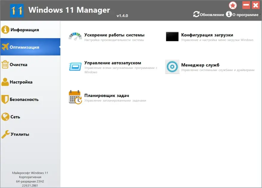 Windows 11 Manager — это мощная универсальная утилита, разработанная для комплексной настройки, оптимизации и обслуживания операционной системы Windows 11. Программа объединяет более сорока встроенных инструментов, позволяя пользователям улучшать производительность системы, устранять ошибки, повышать безопасность и персонализировать интерфейс. С её помощью можно легко управлять автозагрузкой, очищать реестр, настраивать параметры сети и восстанавливать систему при сбоях.