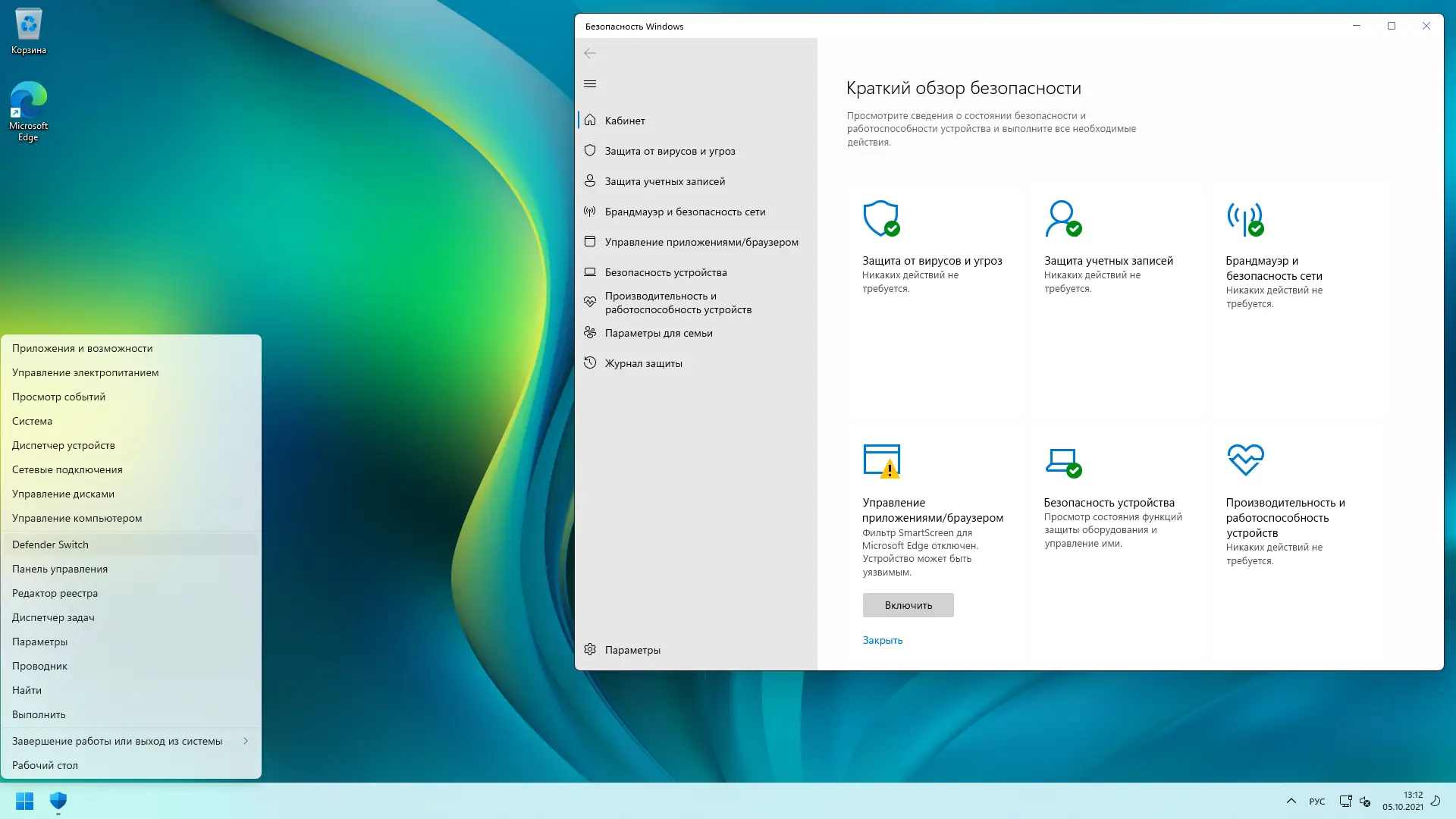 После установки система готова к использованию: контекстное меню возвращено к классическому виду, а в меню «Пуск» добавлены полезные пункты — «Панель управления» и «Редактор реестра». Для быстрого доступа к системным инструментам достаточно правой кнопки мыши. Управление защитником Windows осуществляется через переключатель в меню «Специальные возможности», без необходимости перезагрузки. Пользователь может настроить отображение обоев, изменить поведение проводника и управлять параметрами энергосбережения вручную.