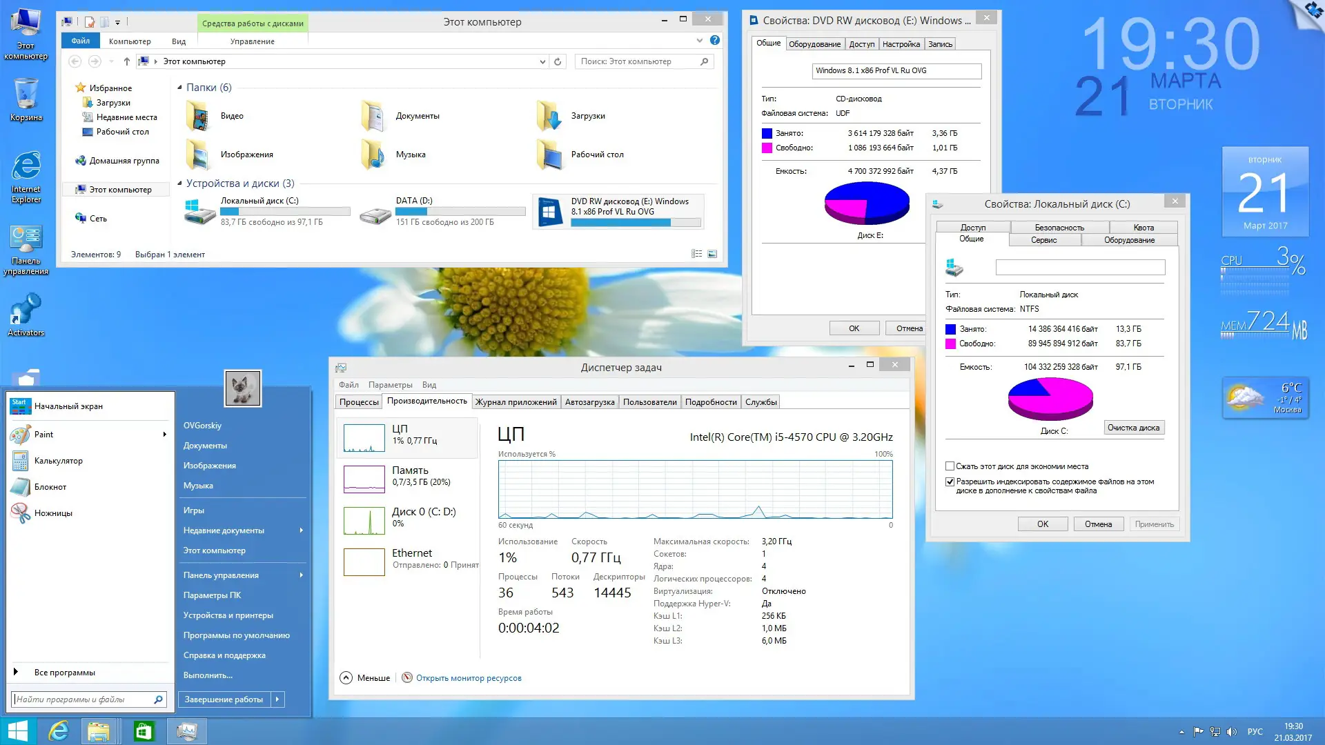 Установка осуществляется стандартным способом — через загрузку с DVD или USB-флешки. Рекомендуется использовать Rufus для создания загрузочного носителя, особенно при работе с UEFI. Во время установки следует отключить автоматическое обновление и подключение к интернету, чтобы избежать конфликтов с драйверами и предотвратить появление черного экрана после перезагрузки. После завершения установки система перезагружается, и запускается внутренний пост-инсталлятор, который устанавливает дополнительные компоненты. Пользователю доступны папки с активаторами, темами, аватарами и утилитами, расположенными на системном диске. Для настройки внешнего вида рекомендуется использовать OldNewExplorer, который улучшает отображение проводника и тем оформления.