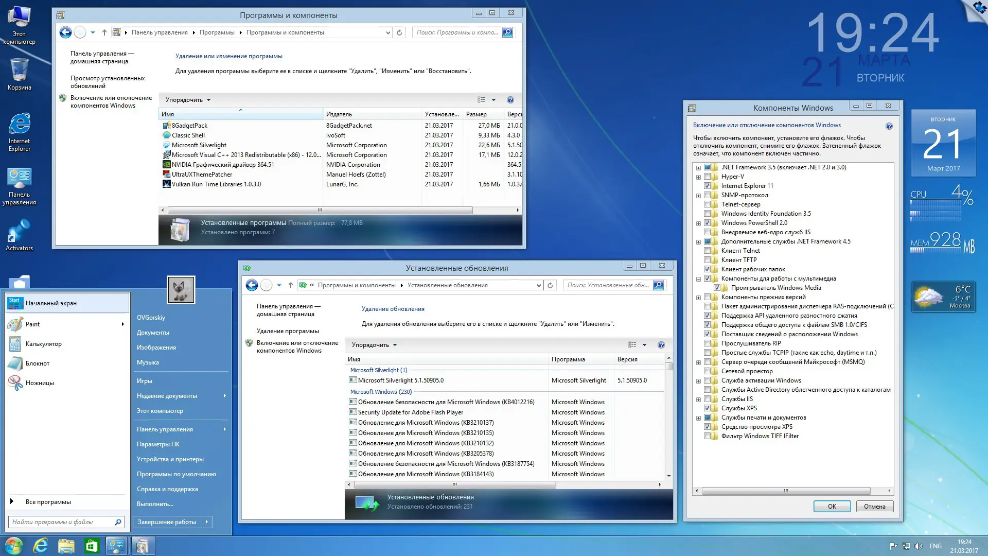- Установка гаджетов рабочего стола с помощью 8GadgetPack для удобства и персонализации.