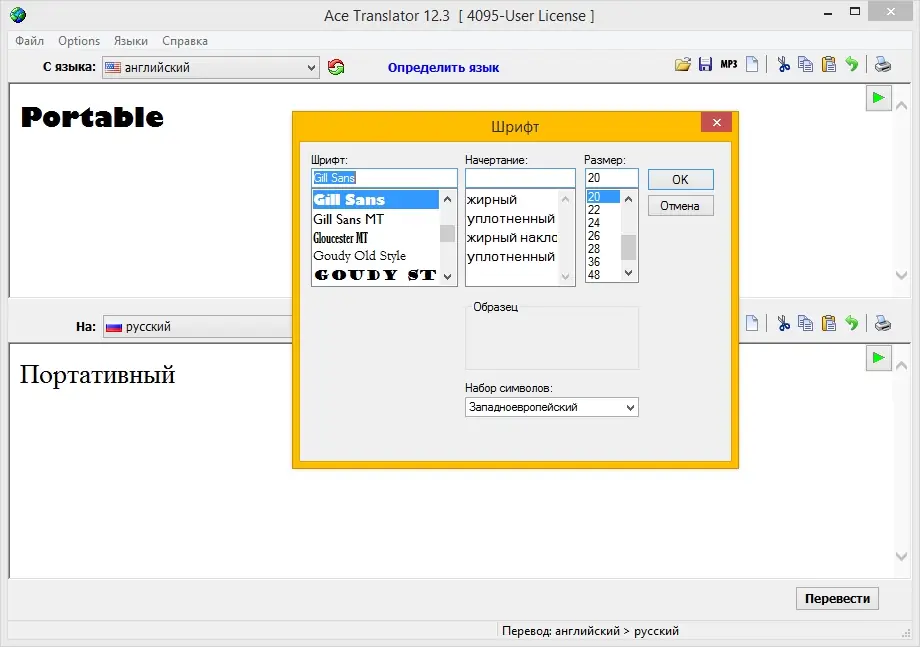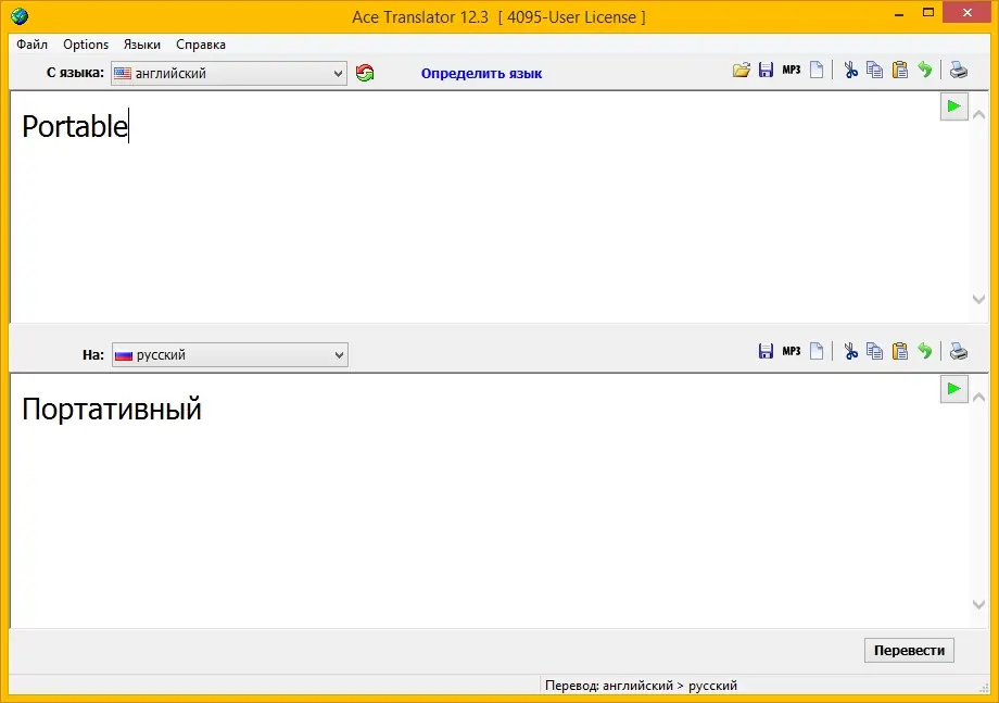После установки приложения пользователь может сразу приступить к переводу текста. Достаточно вставить нужный фрагмент в левое поле, выбрать исходный и целевой языки, после чего нажать кнопку перевода. Результат появится в правом окне, где его можно редактировать, копировать или озвучить с помощью встроенной TTS-системы. Для активации всех возможностей необходимо использовать данные из файла «ключи», прилагаемого к установщику.
