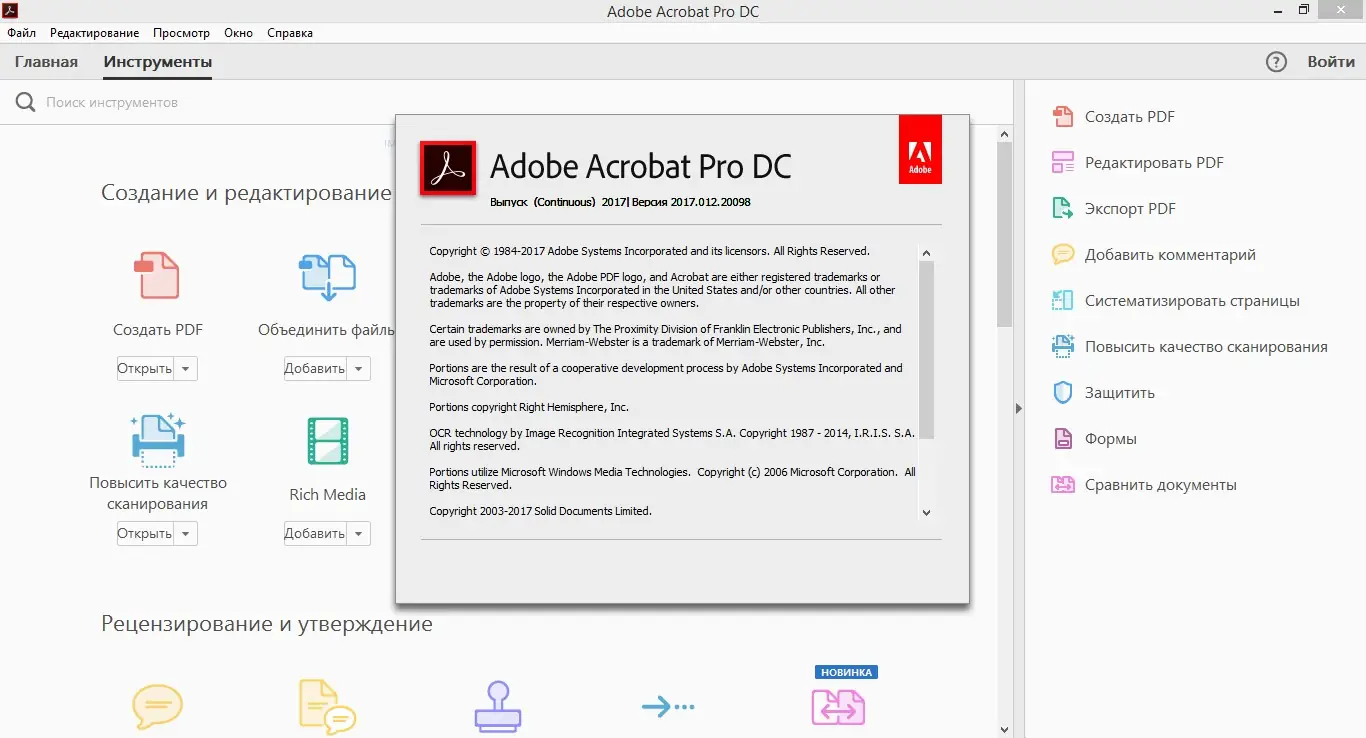 Adobe Acrobat DC — это передовое программное решение для работы с PDF-документами, обеспечивающее полноценное редактирование, создание, конвертацию и подписание файлов на любом устройстве. Интеграция с облачными сервисами Document Cloud позволяет синхронизировать документы между компьютером, планшетом и смартфоном. Программа поддерживает широкий спектр функций, необходимых как для повседневного офисного использования, так и для профессиональной обработки документов.