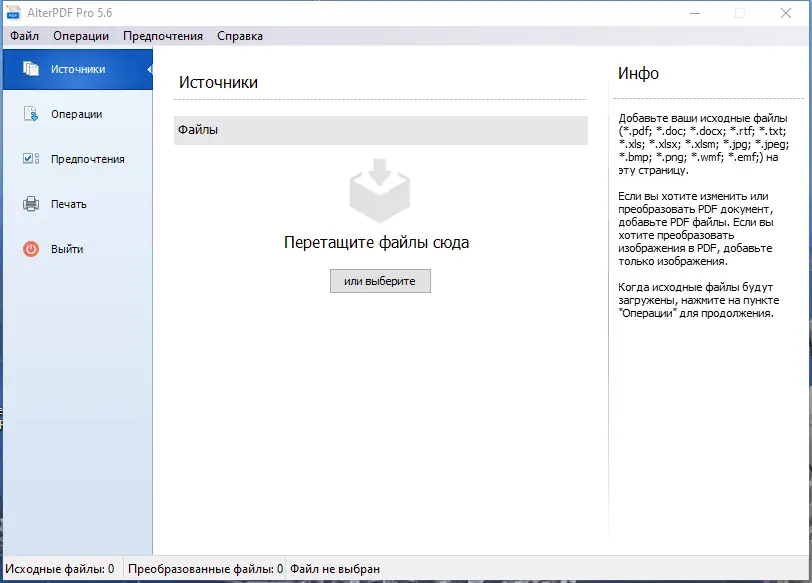 Использование программы не требует углублённых знаний — все функции организованы в виде отдельных модулей, доступных через главное меню. Пользователь выбирает нужное действие, добавляет файлы через кнопку «Добавить» или перетаскиванием, настраивает параметры, если это необходимо, и запускает обработку. После завершения операции результат сохраняется в указанной папке, а программа готова к следующей задаче. Поддержка портативной версии позволяет запускать AlterPDF с флешки без установки.