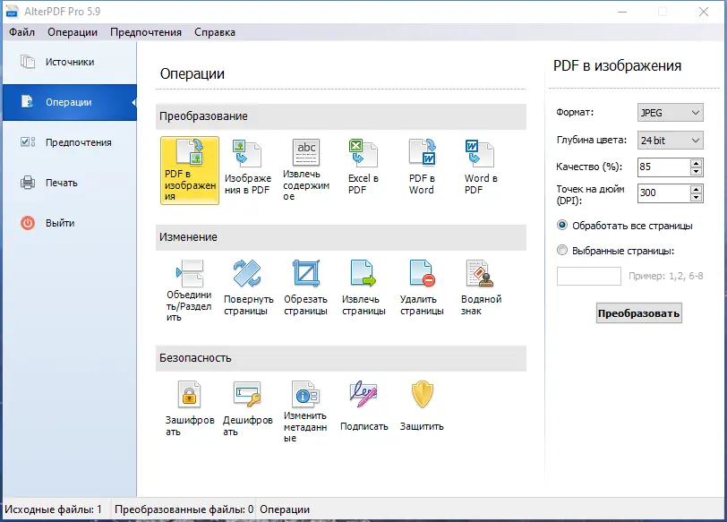 Использование AlterPDF не требует специальных навыков. После запуска программы пользователь видит главное меню с перечнем доступных операций, таких как конвертация, редактирование, объединение и разделение файлов. Достаточно выбрать нужную функцию, загрузить PDF-документ или изображение, настроить параметры при необходимости и запустить процесс. Все действия выполняются в несколько кликов, а результат сохраняется в указанной папке.
