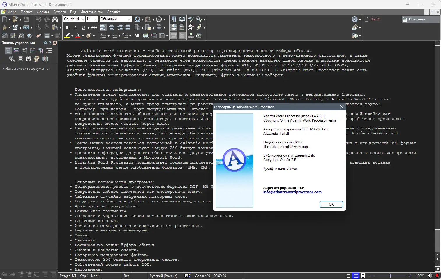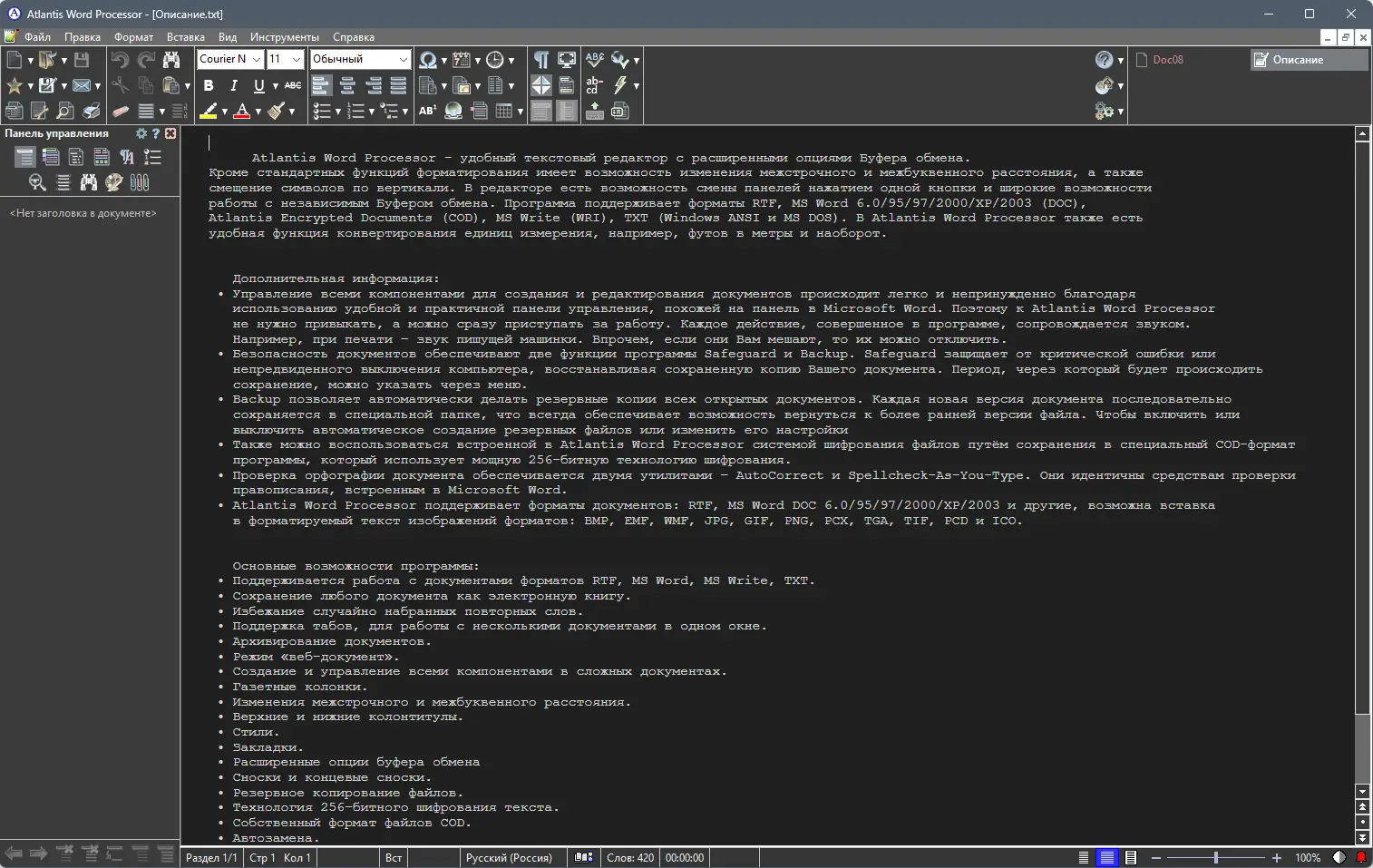 Atlantis Word Processor сочетает в себе функциональность, надёжность и удобство, оставаясь при этом компактным и быстрым в работе.