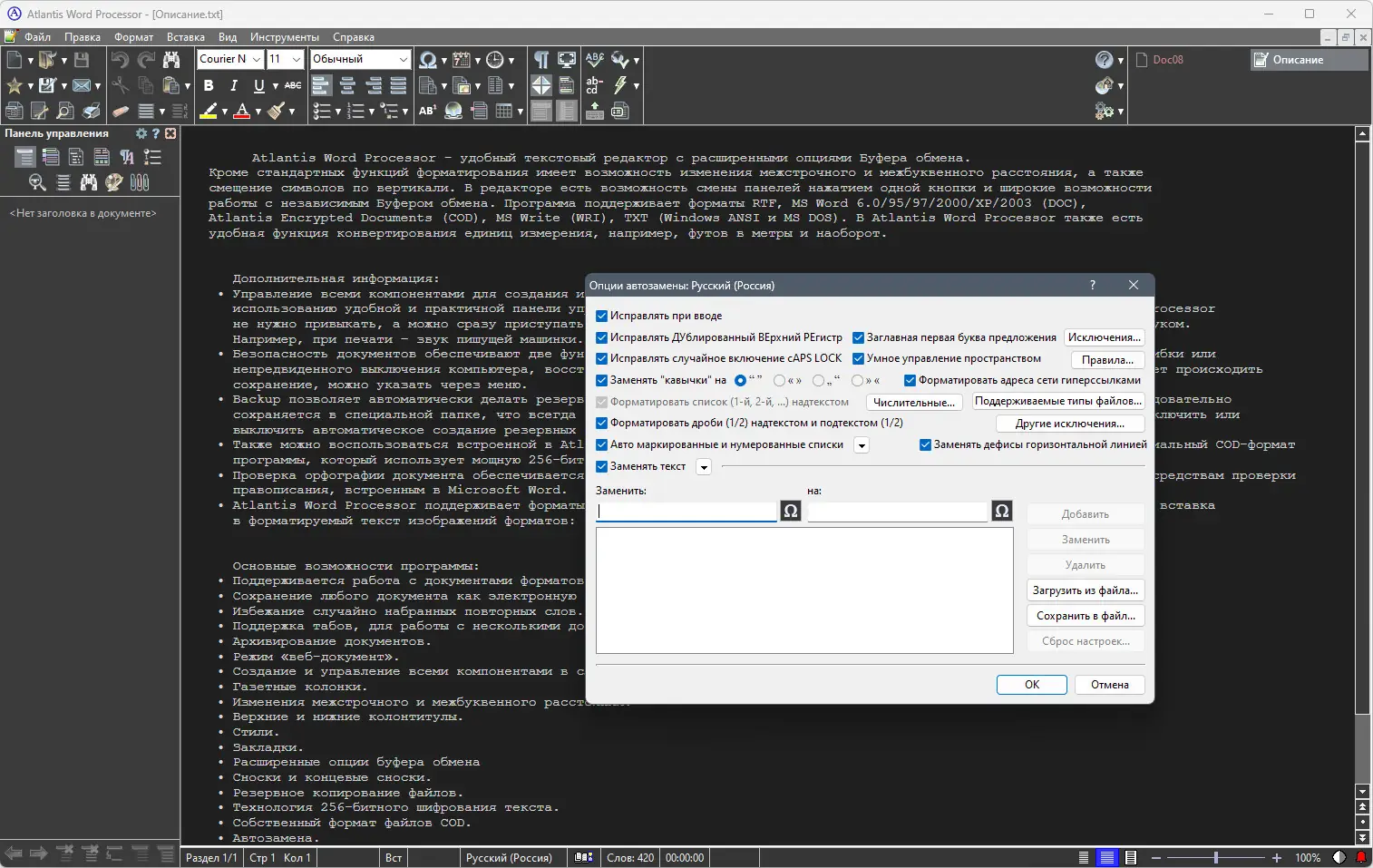 Atlantis Word Processor предлагает стабильную работу, широкие возможности форматирования и надёжную защиту документов. Программа поддерживает настройку интерфейса, горячих клавиш и звуковых эффектов, адаптируясь под предпочтения пользователя. Функция автосохранения и резервного копирования защищает от потери данных при сбоях. Поддержка модулей проверки орфографии на русском и украинском языках расширяет её применение в регионах СНГ. Благодаря включённой поддержке на русском и наличию portable-режима, программа подходит как для домашнего, так и для профессионального использования.