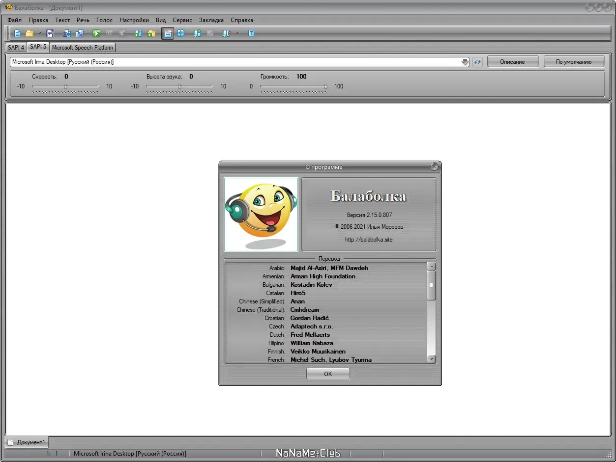 Balabolka — это универсальная читалка, преобразующая текст в речь с использованием доступных на компьютере голосовых движков. Программа поддерживает широкий спектр форматов, включая PDF, DOCX, EPUB, FB2, HTML и другие, обеспечивая корректное извлечение и обработку текста. Она совместима с различными версиями Microsoft Speech API, что позволяет использовать как стандартные, так и сторонние голоса, включая современные реализации на базе нейросеть.