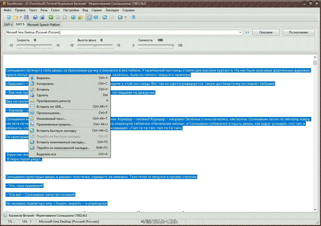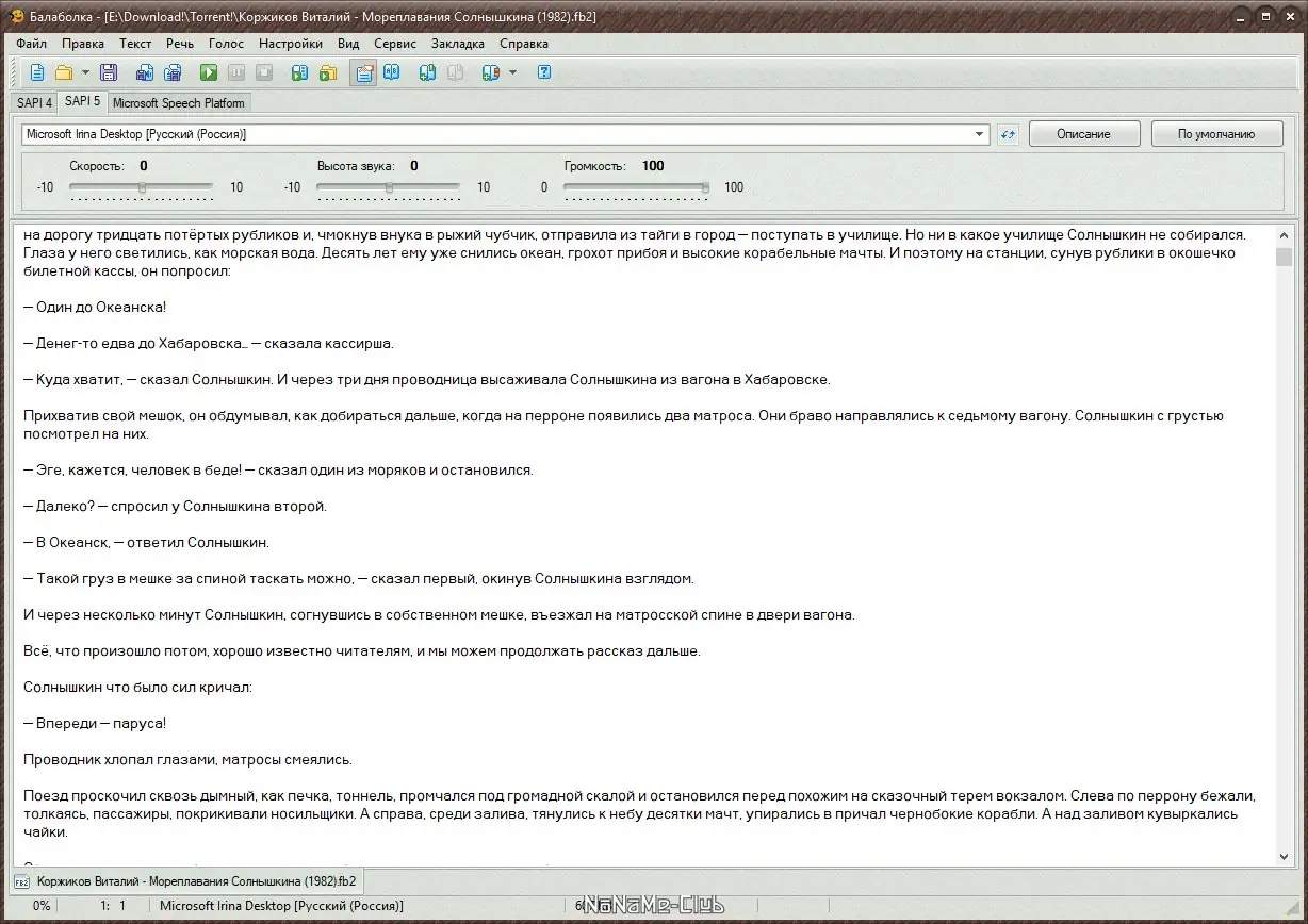 Balabolka — это мощная читалка, преобразующая текстовые файлы в речь с использованием встроенных голосовых синтезаторов. Программа поддерживает множество форматов документов и позволяет озвучивать текст с различными настройками произношения. Подходит для пользователей, которым необходимо слушать тексты, электронные книги или рабочие документы без напряжения глаз.