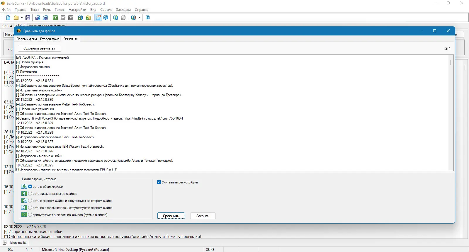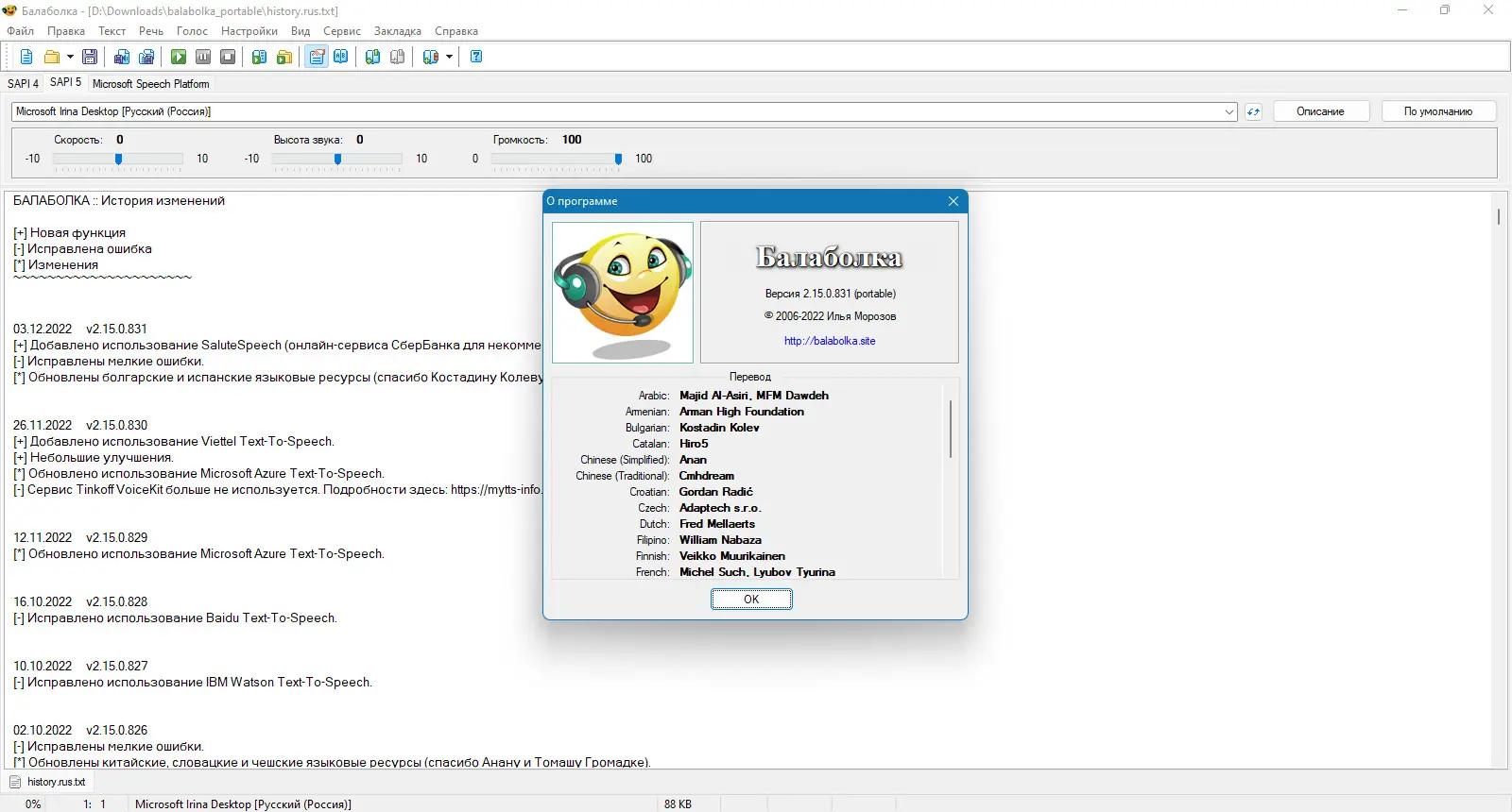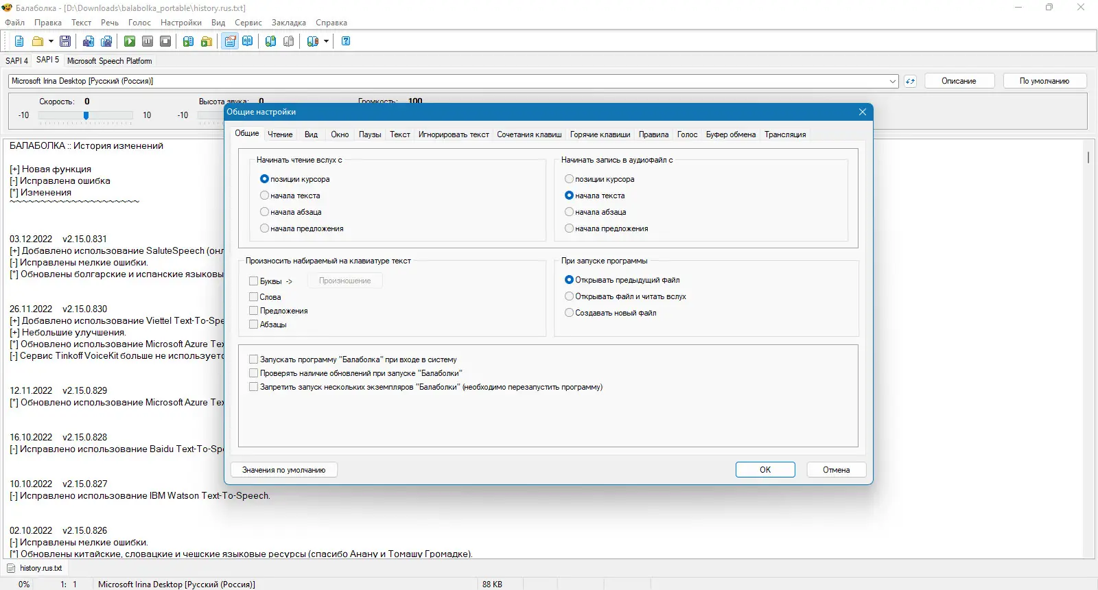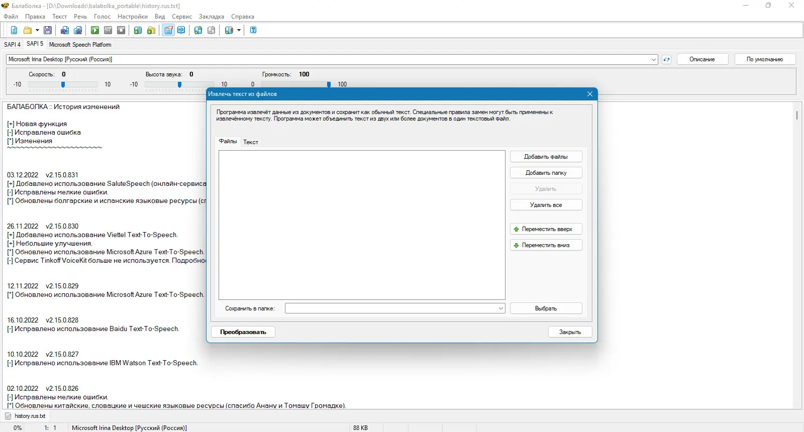 Balabolka — программа для чтения текста вслух, использующая установленные на компьютере голосовые движки. Поддерживает широкий спектр форматов документов и возможность конвертации текста в аудиофайлы различных типов. Идеально подходит для озвучки книг, статей и учебных материалов.