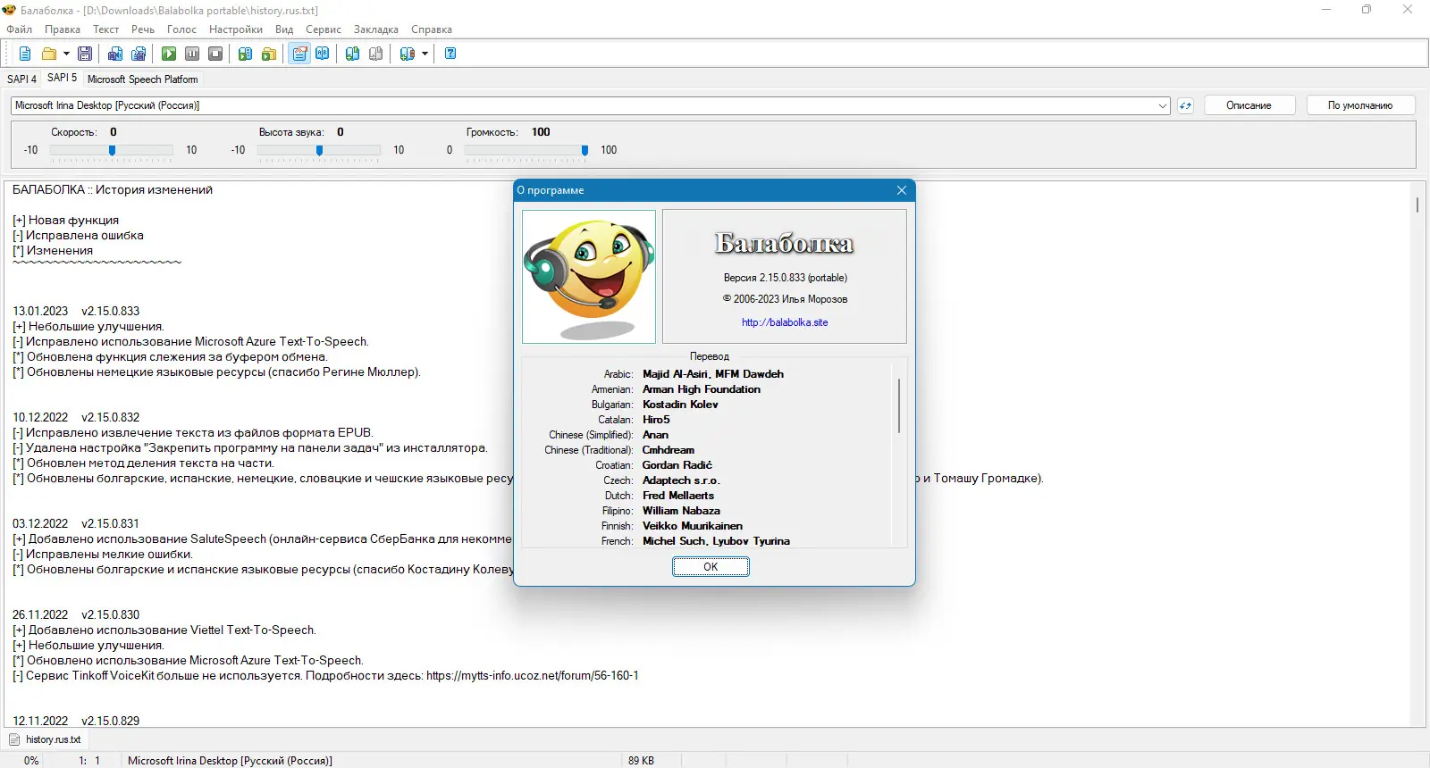 Balabolka — программа для чтения текстовых файлов вслух с поддержкой различных форматов и возможностью сохранения озвученного контента в аудиофайлы. Приложение использует установленные на компьютере голосовые синтезаторы, включая совместимые с Microsoft Speech API. Поддержка множества настроек позволяет адаптировать процесс озвучки под индивидуальные предпочтения пользователя.