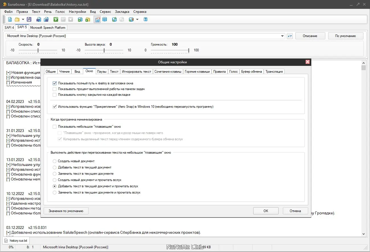 Программа совместима с различными версиями Microsoft Speech API, включая SAPI 4 и SAPI 5, что обеспечивает гибкость при выборе голосов.