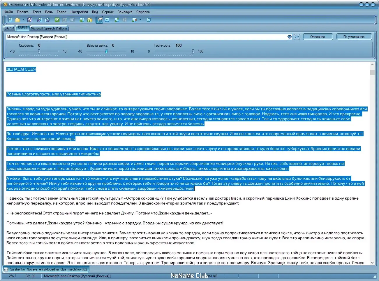 Balabolka — это текстовый ридер, преобразующий письменный контент в устную речь с помощью технологии tts. Программа совместима с различными версиями Microsoft Speech API и поддерживает широкий спектр форматов, включая PDF, DOCX, EPUB, MOBI, HTML и другие. Она подходит для пользователей, которым необходимо слушать тексты без визуального восприятия, а также для тех, кто хочет проверить произношение или создать аудиозаписи на основе текстовых материалов.