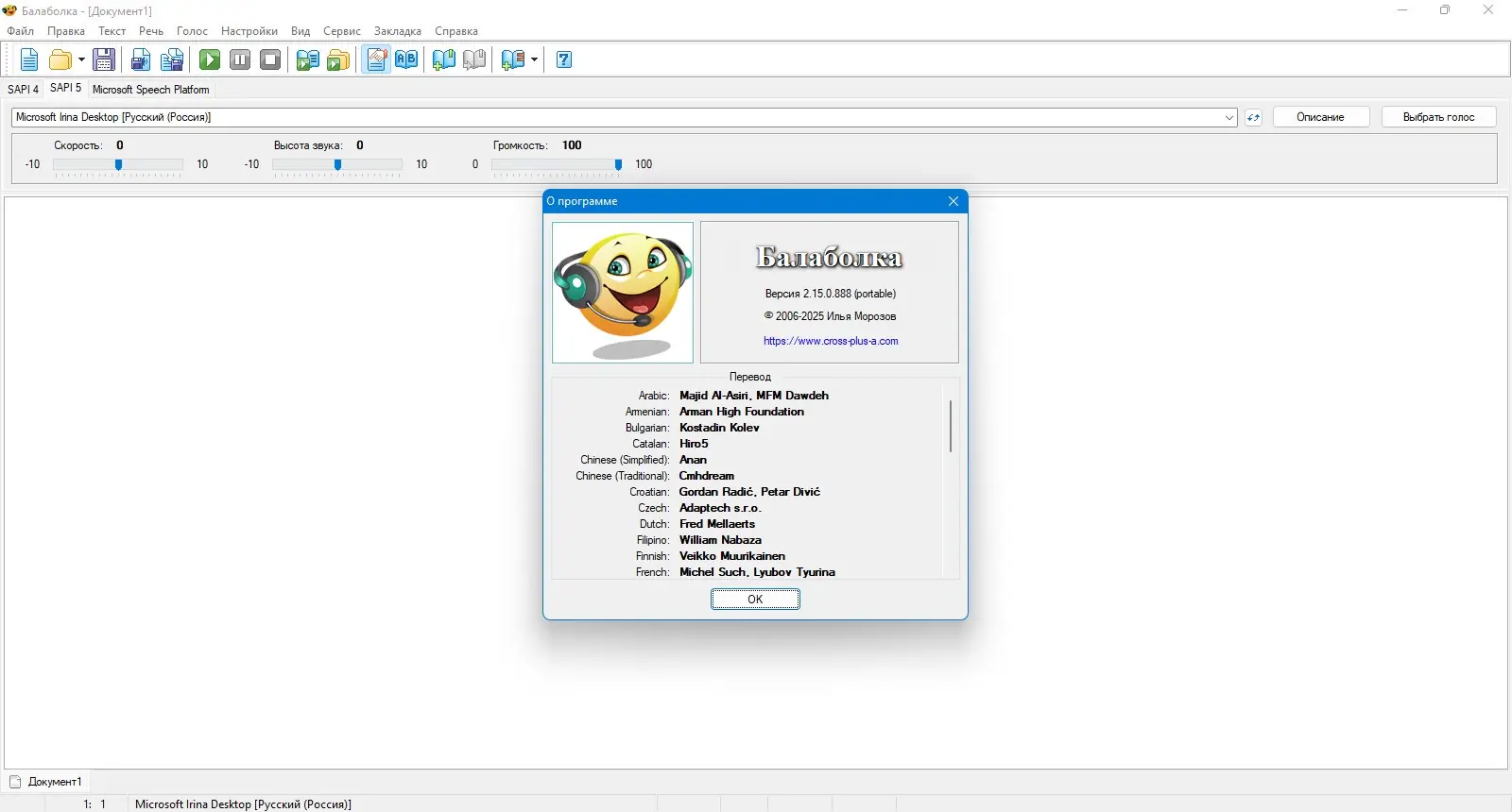 Balabolka — это программное обеспечение, предназначенное для озвучивания текстовой информации с помощью синтеза речи. Приложение работает с широким спектром форматов, включая PDF, DOCX, EPUB, FB2, HTML и другие, что делает его универсальным инструментом в категории офисных читалок. Основой функционала является использование доступных на системе голосовых движков, включая различные версии Microsoft Speech API, что обеспечивает гибкость и совместимость.