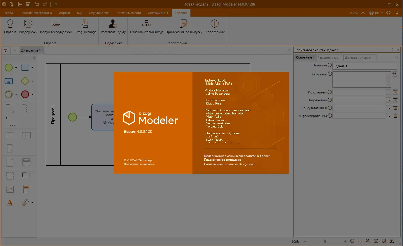 После установки программы необходимо авторизоваться на портале разработчика, так как приложение требует онлайн-подключения для активации. Интерфейс построен интуитивно: слева расположена палитра элементов BPMN, в центре — рабочая область для построения диаграмм, справа — панель свойств. Пользователь может добавлять задачи, события, шлюзы, потоки данных и комментарии, настраивать атрибуты каждого элемента и организовывать процессы по уровням абстракции.