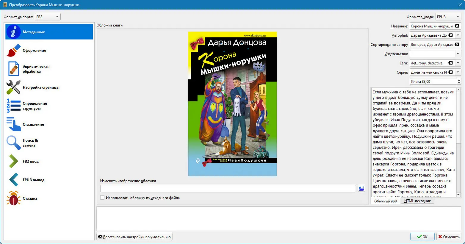 Работа с программой начинается с импорта книг в библиотеку, после чего Calibre автоматически анализирует файлы и подтягивает недостающую информацию. Пользователь может редактировать метаданные, добавлять теги, комментарии и обзоры. Для конвертации достаточно выбрать книгу, указать нужный формат и настроить параметры шрифта, полей или структуры.