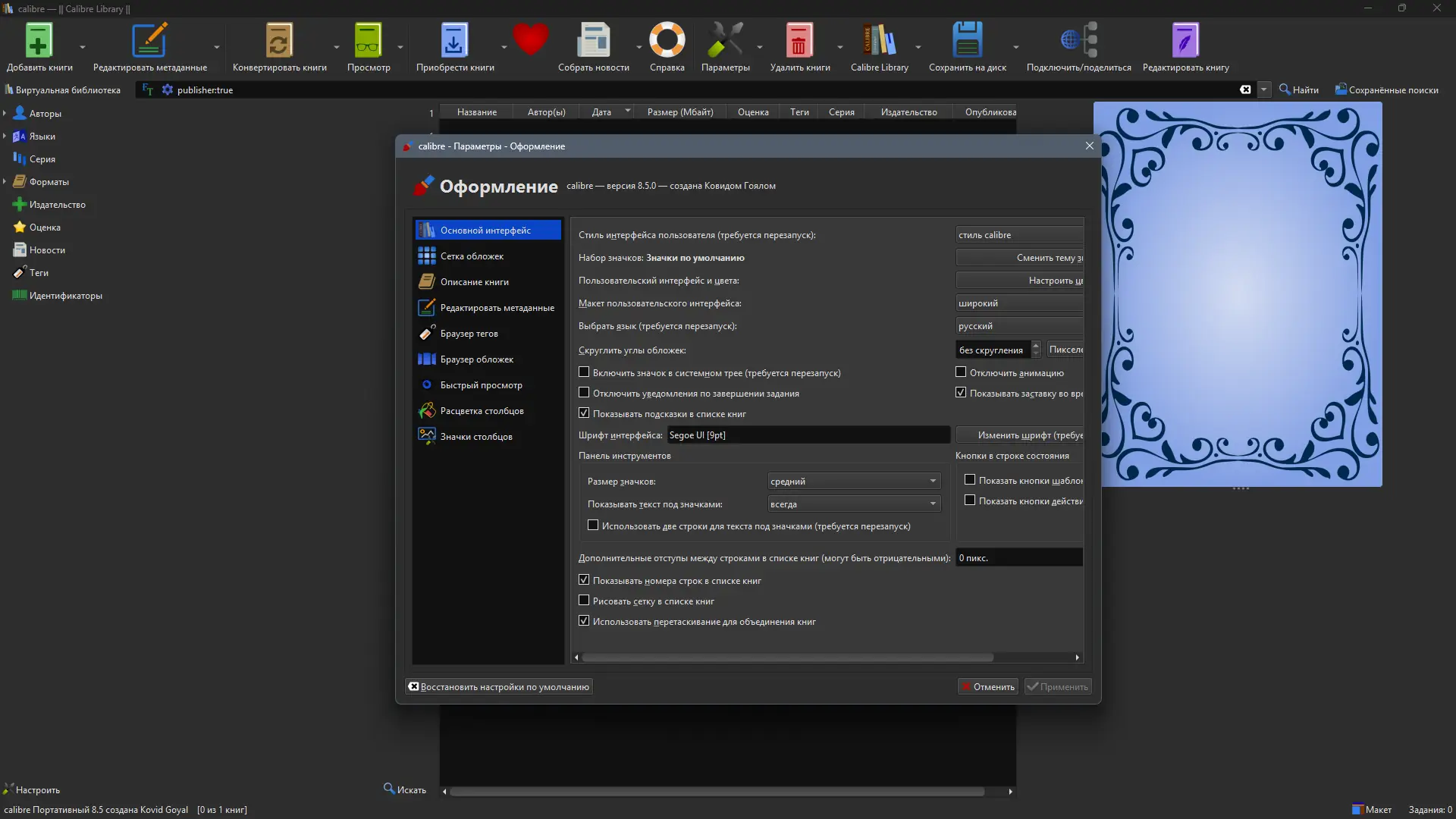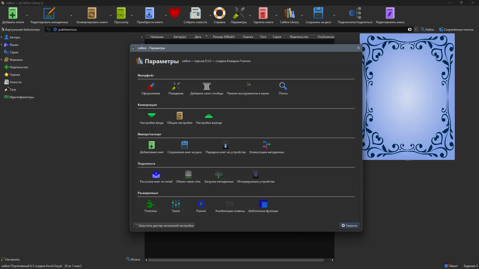 - Поддержка широкого спектра форматов для импорта и экспорта, включая EPUB, MOBI, PDF и другие