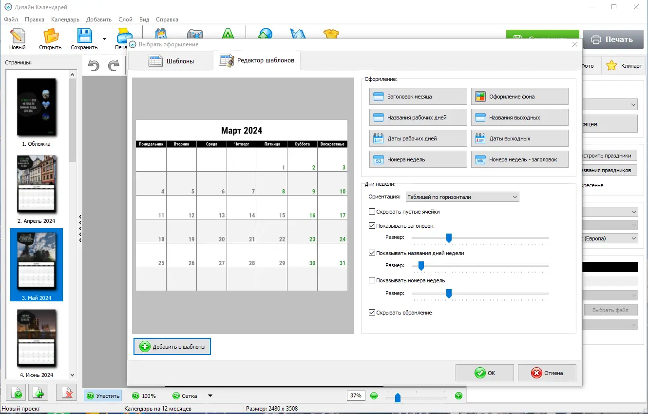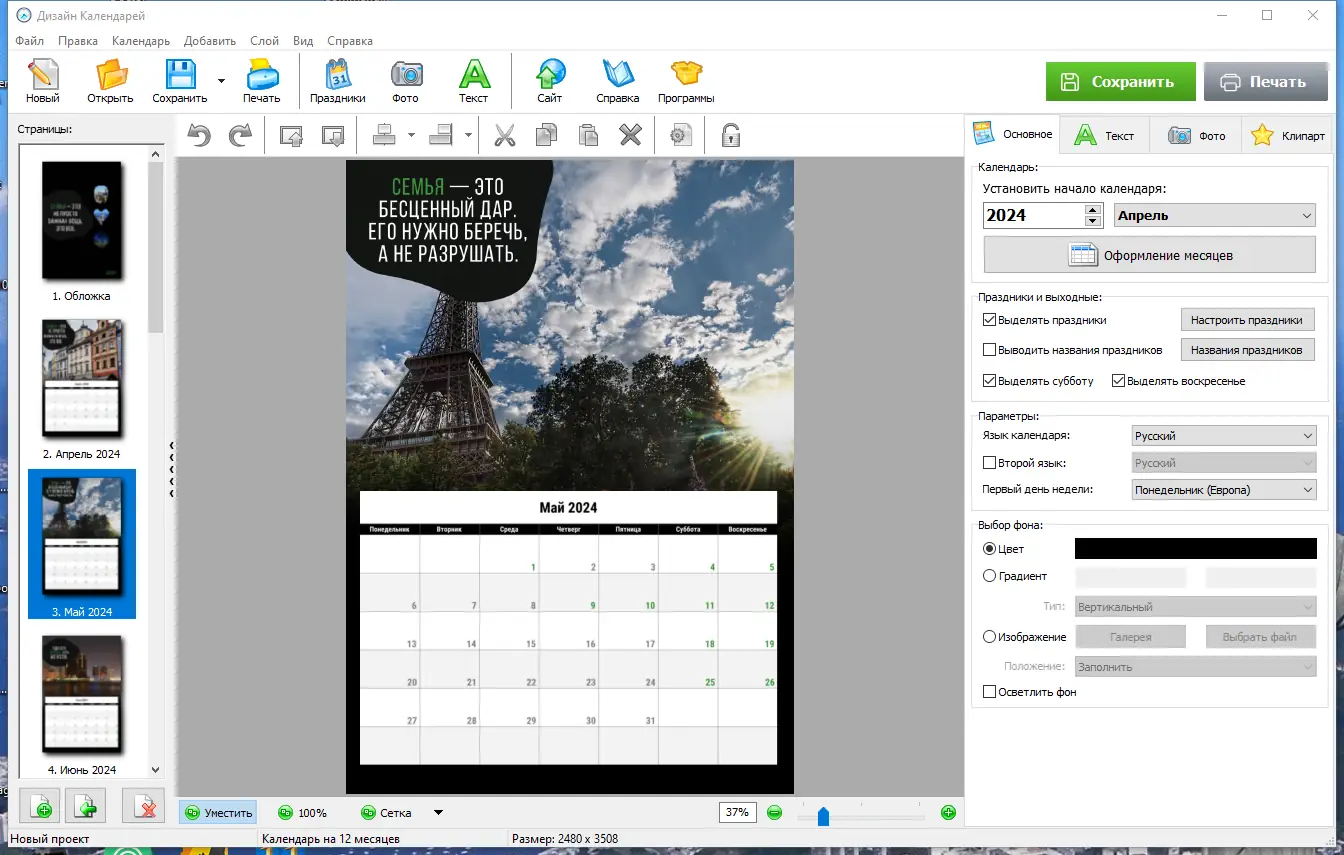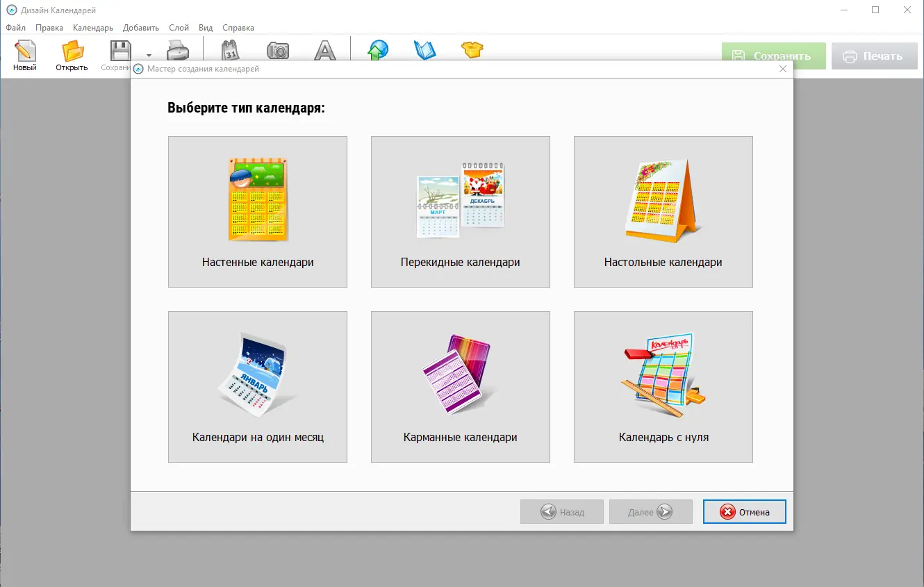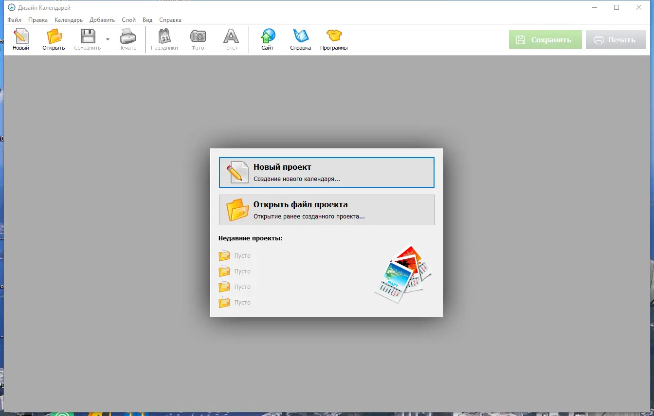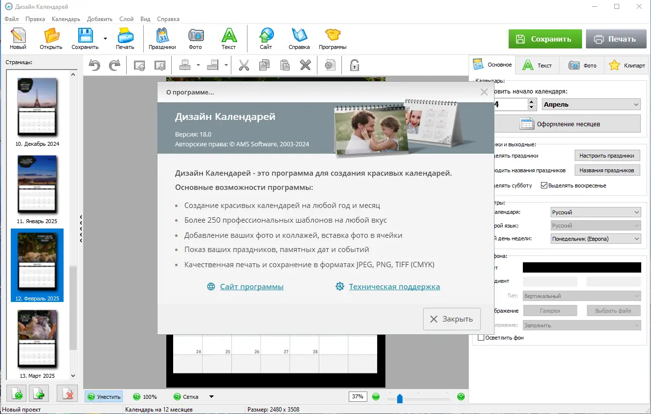 Дизайн Календарей — это простая в использовании программа для создания персонализированных календарей с фотографиями на любой год или месяц. Поддержка множества шаблонов, настройка праздников и экспорт в различные форматы делают её идеальным решением как для домашнего, так и для корпоративного использования. Инструмент позволяет изготавливать календари разных форматов — от карманных до настенных, с возможностью последующей печати в типографии или дома.