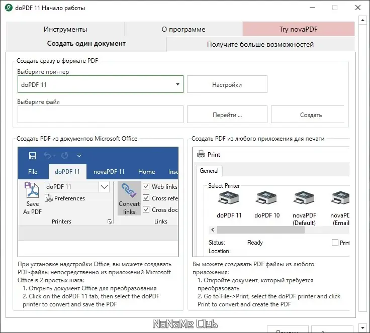 Программа doPDF добавляет в систему виртуальное печатающее устройство, которое позволяет конвертировать документы в PDF без необходимости использования громоздких пакетов офисных приложений. Достаточно открыть нужный файл и выбрать в меню печати doPDF — документ будет автоматически сохранён в указанной папке в формате PDF. Поддержка охватывает широкий спектр форматов: от текстовых документов и таблиц до веб-страниц и электронных писем.