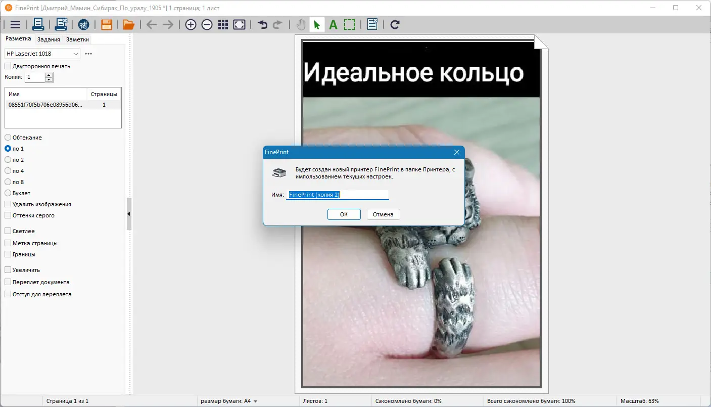 Использование FinePrint не требует специальных навыков. Достаточно выбрать его в окне печати из списка доступных принтеров, после чего откроется графическое окно настройки. Здесь можно просмотреть все страницы задания, удалить ненужные, изменить порядок, вставить фирменный бланк или подложку. Доступны режимы масштабирования, настройки полей, добавление рамок и водяных знаков. После настройки параметров документ отправляется на физический принтер, при этом все изменения применяются без изменения оригинального файла. Также можно сохранить задание в одном из графических форматов — JPEG, TIFF, BMP или в собственном формате FP.
