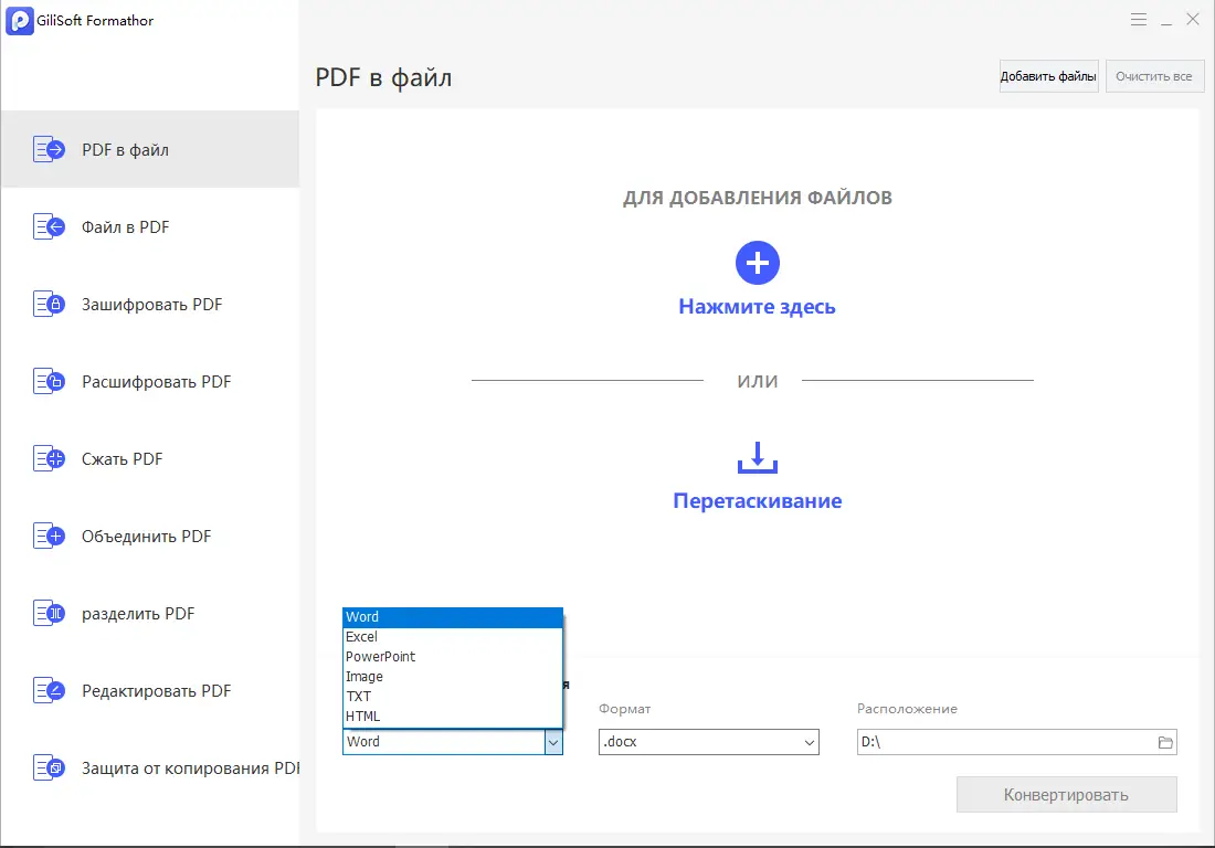 GiliSoft Formathor разработан для эффективной работы с PDF-файлами, предлагая широкий спектр инструментов в едином интерфейсе. Программа позволяет не только конвертировать документы в форматы Word, Excel, HTML и изображения, но и выполнять обратное преобразование. Это делает её универсальным решением для пользователей, которым необходимо обмениваться информацией между различными платформами и приложениями.