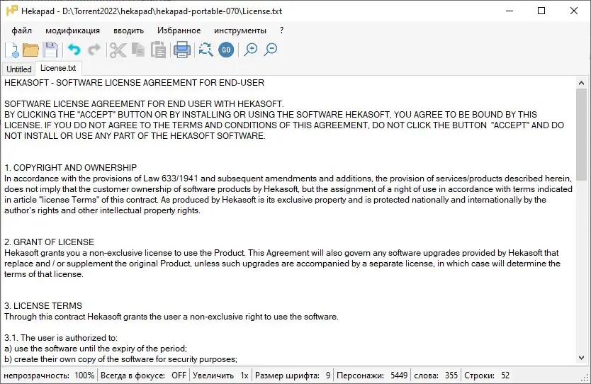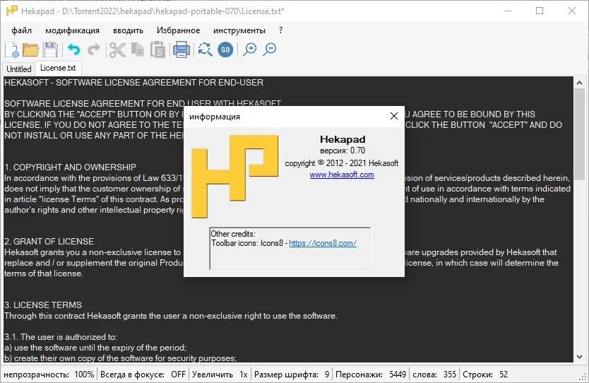 Использование Hekapad не требует специальных знаний. После запуска достаточно открыть нужный файл через меню «Файл» или перетащить его в окно редактора. Для поиска и замены текста доступна соответствующая функция с подсветкой совпадений. Спецсимволы можно вставлять через отдельную панель, что ускоряет ввод специальных обозначений. Окно редактора легко настраивается: его можно сделать полупрозрачным или зафиксировать поверх других приложений для сверки данных.
