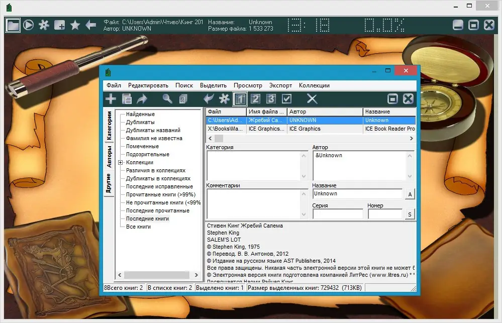ICE Book Reader выделяется на фоне аналогичных решений благодаря глубокой интеграции функций чтения, каталогизации и конвертации. Архитектура базы данных исключает потерю целостности при редактировании файлов вне программы, что редко встречается в других приложениях. Поддержка множества форматов и кодировок делает её универсальным инструментом для пользователей с разнообразными задачами.