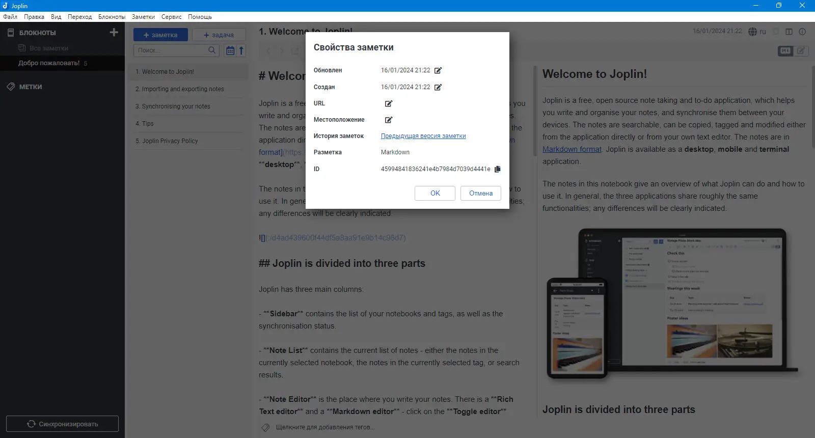 Joplin позволяет создавать, редактировать и систематизировать большое количество заметок, организуя их в блокноты и снабжая тегами для удобного поиска. Все записи хранятся в формате Markdown, что обеспечивает лёгкость редактирования вне приложения и долгосрочную совместимость. Поддержка импорта файлов .enex из Evernote включает перенос форматированного текста, изображений, вложений и метаданных, таких как дата создания и геолокация.