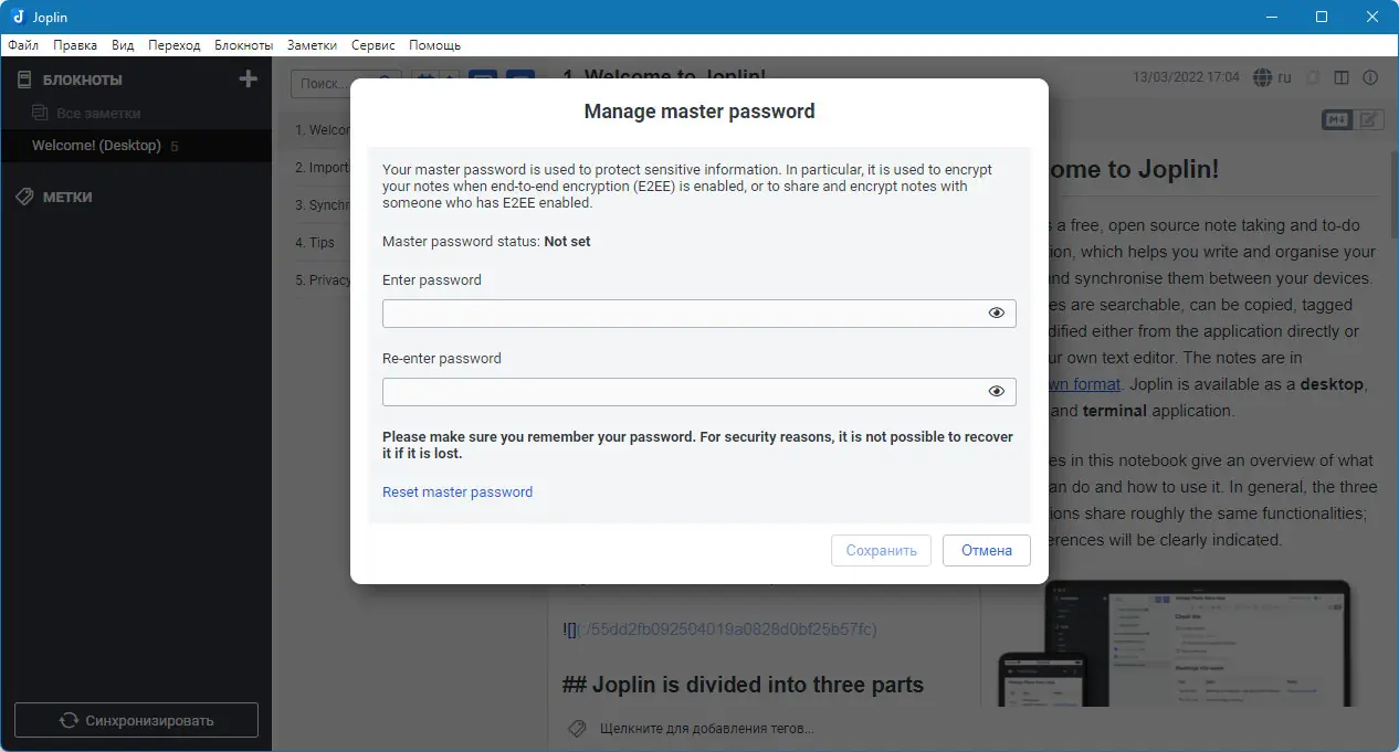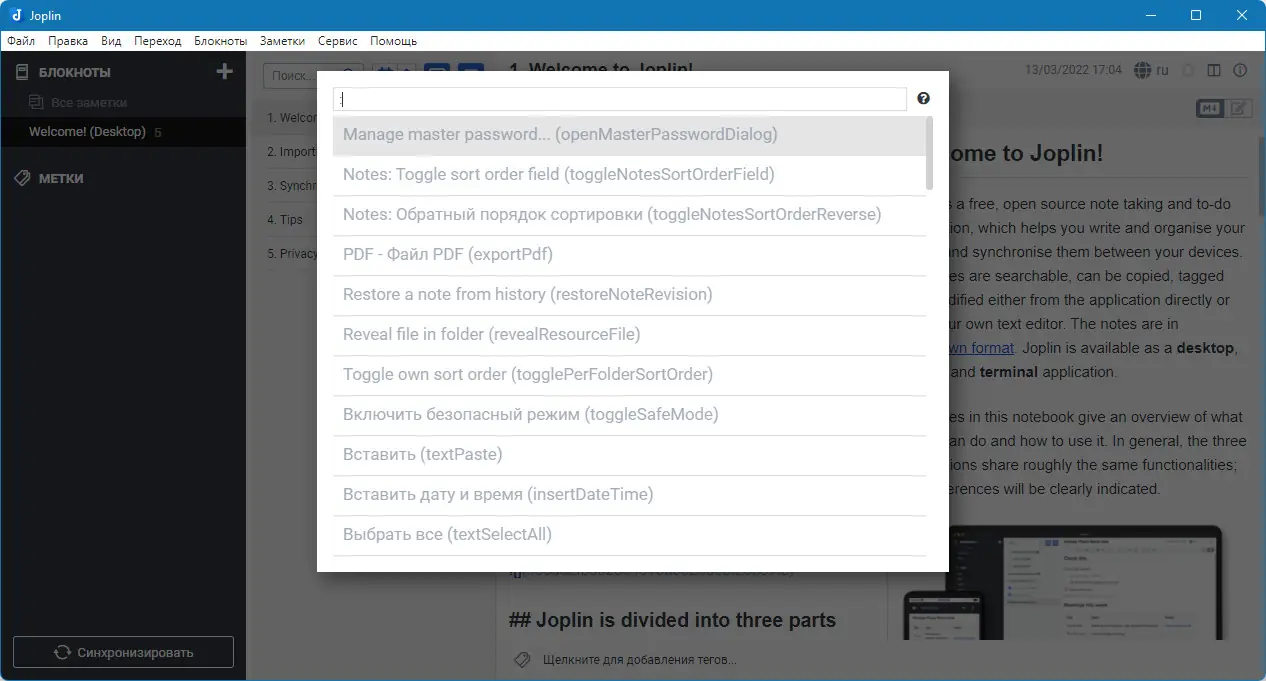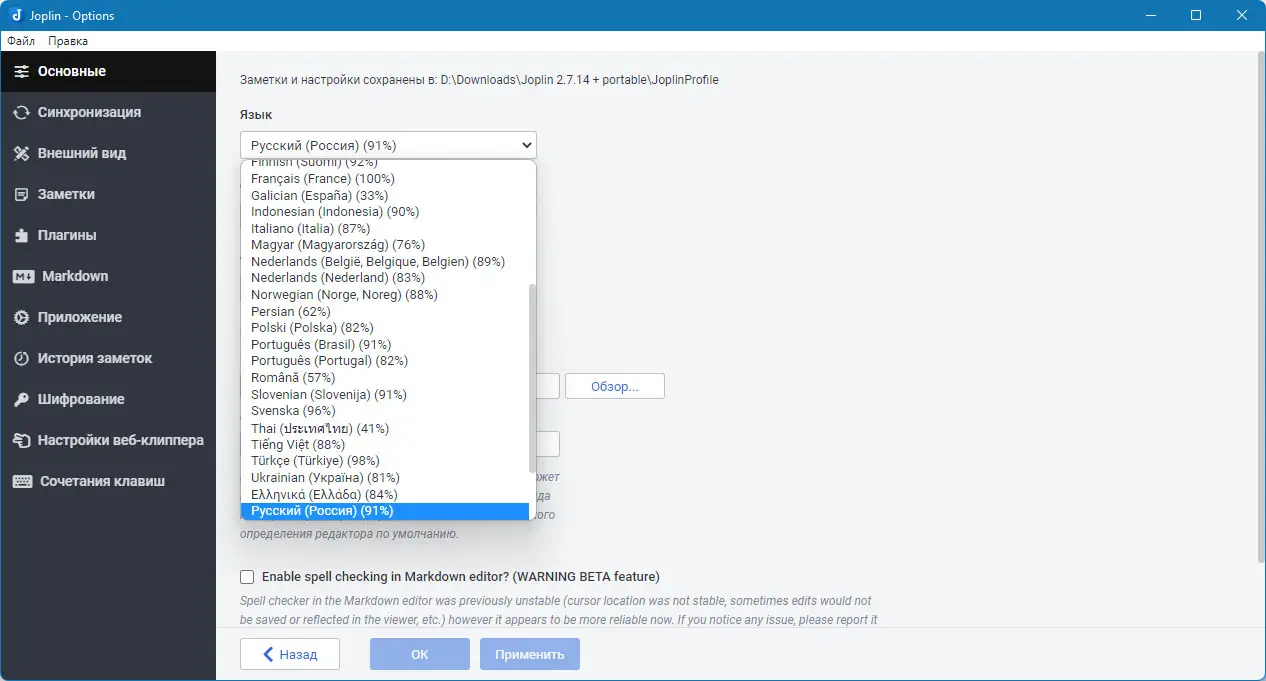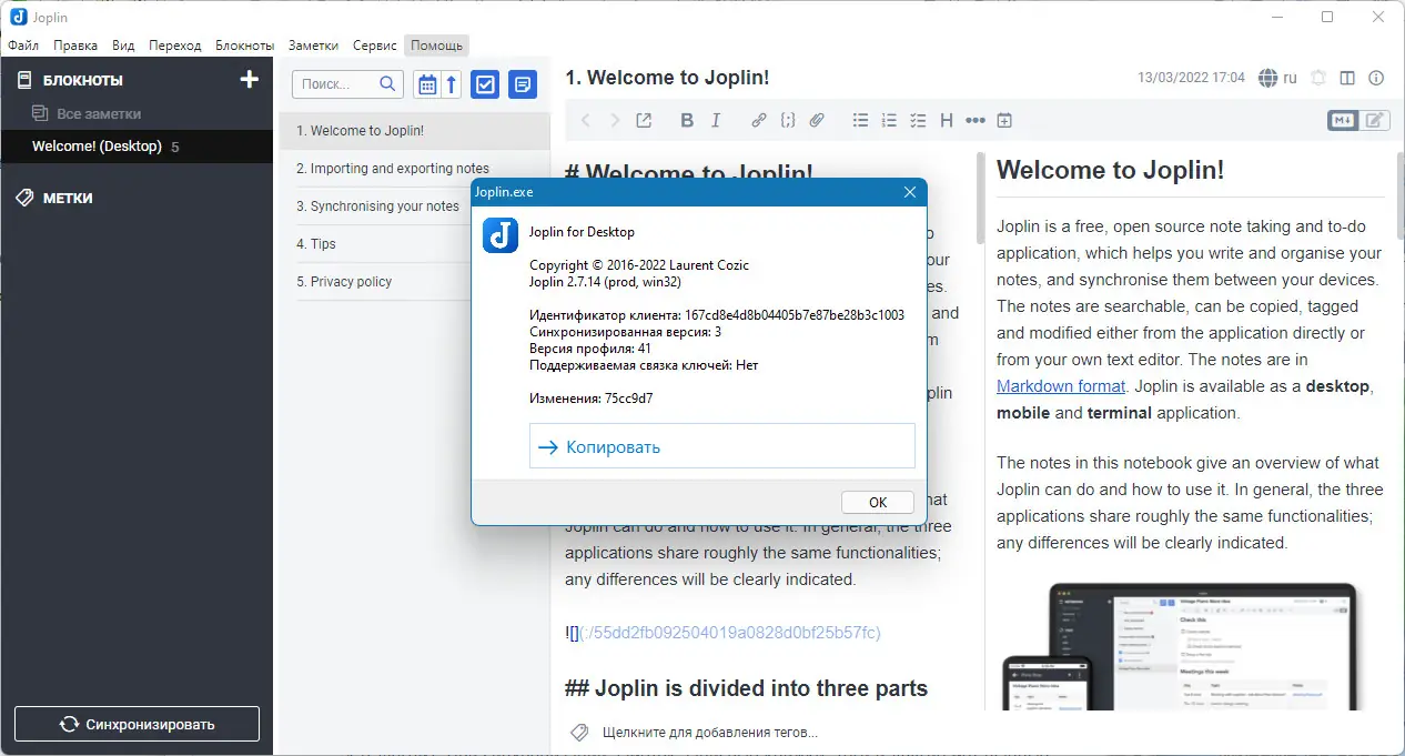 Joplin позволяет создавать и управлять заметками, организованными в блокноты и снабжённые тегами для быстрого поиска. Все записи хранятся в формате Markdown, что обеспечивает лёгкость редактирования и совместимость с текстовыми редакторами. Приложение поддерживает полный импорт из Evernote через файлы .enex, включая форматированный текст, изображения, вложения и метаданные, такие как дата создания и геолокация. Также доступен импорт простых Markdown-файлов, что делает переход с других систем максимально гибким. Синхронизация возможна через Dropbox, OneDrive, Nextcloud, WebDAV или локальную файловую систему, включая сетевые папки.