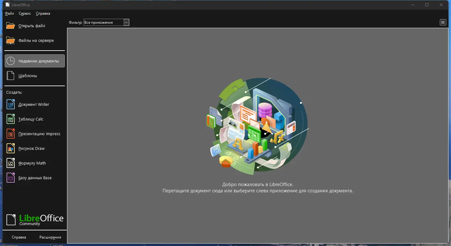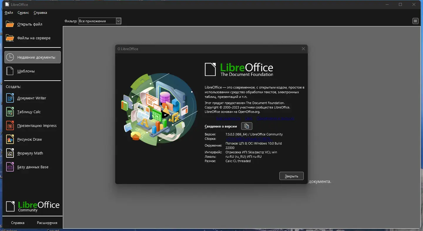 LibreOffice — это полнофункциональный офисный пакет, разработанный на основе исходного кода OpenOffice.org, который активно развивается сообществом разработчиков. Он предназначен для создания, редактирования и управления текстовыми документами, электронными таблицами, презентациями, векторной графикой и базами данных. Программа поддерживает широкий спектр форматов, включая DOCX, XLSX, PPTX и собственный стандарт ODF, соответствующий международному ISO.