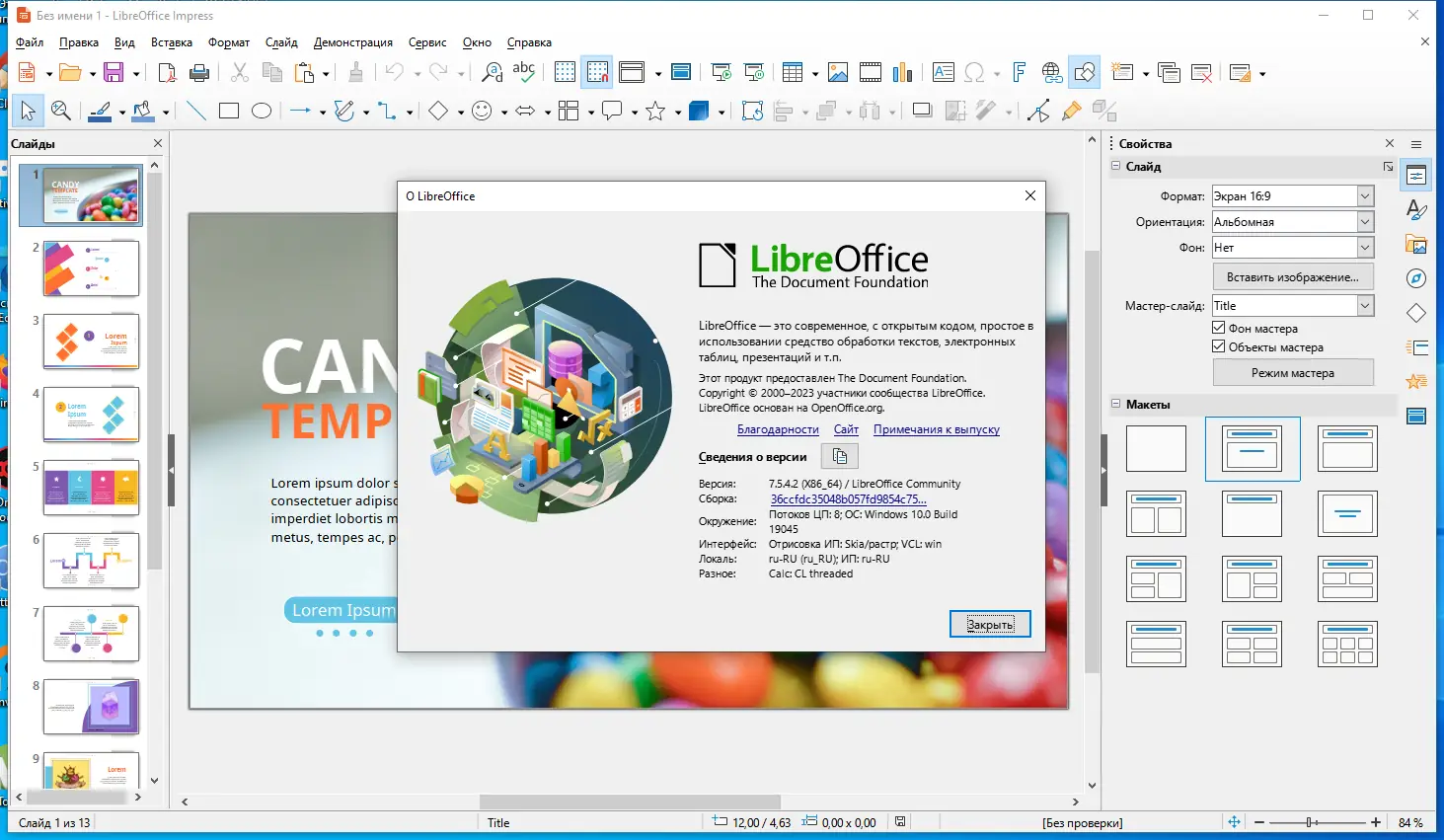 LibreOffice — это полнофункциональный офисный пакет с открытым исходным кодом, разработанный для создания, редактирования и управления документами различных типов. Он включает в себя приложения для обработки текстов, электронных таблиц, презентаций, векторной графики и баз данных. Программа совместима с множеством форматов, включая файлы Microsoft Office, и поддерживает экспорт в PDF.