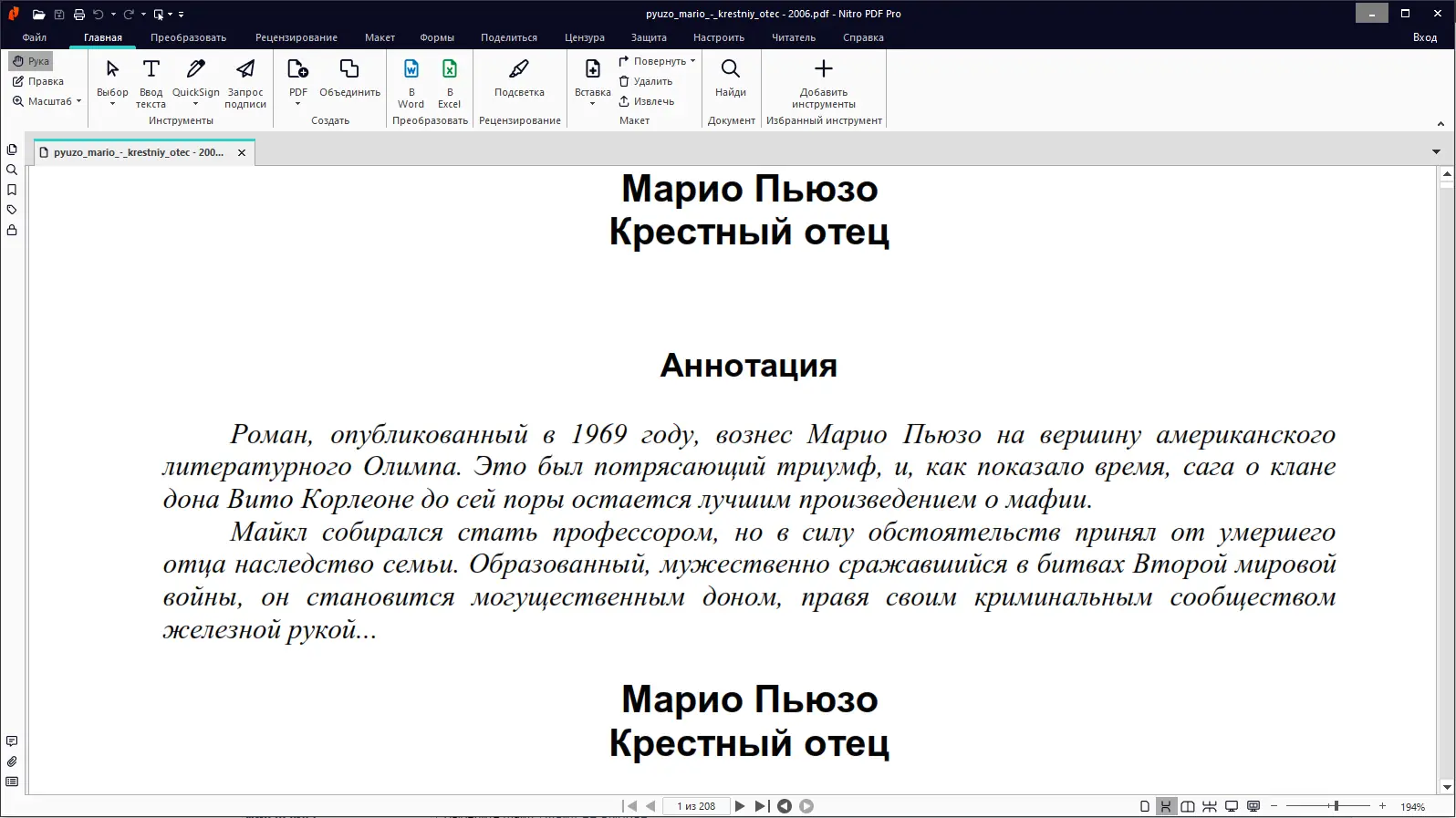 Работа с Nitro Pro начинается с создания или открытия PDF-файла. Через вкладку «Файл» можно преобразовать документ из Word, Excel или другого формата, а также объединить несколько файлов в один. Для редактирования текста используется инструмент «Изменить текст», позволяющий вносить правки, изменять шрифт и размер. Изображения можно вставлять, заменять, обрезать или настраивать по яркости и контрасту. В режиме комментариев доступны выделение, подчёркивание, добавление заметок и рисование фигур. Перед отправкой документа его можно зашифровать, добавить цифровую подпись или ограничить печать и копирование. Все действия выполняются через понятное меню, не требующее специальных навыков.