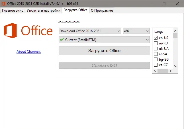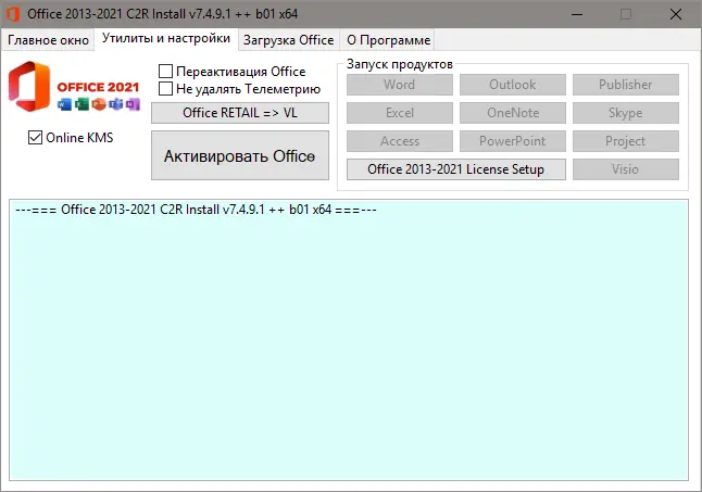 Программа для установки Microsoft Office 2013–2021 с поддержкой выбора версии, языка и разрядности. Позволяет создать офлайн-дистрибутив и активировать пакет через KMS или конвертировать в Volume-редакцию. Упрощает процесс инсталляции и управления компонентами офисного набора на компьютере под управлением windows.