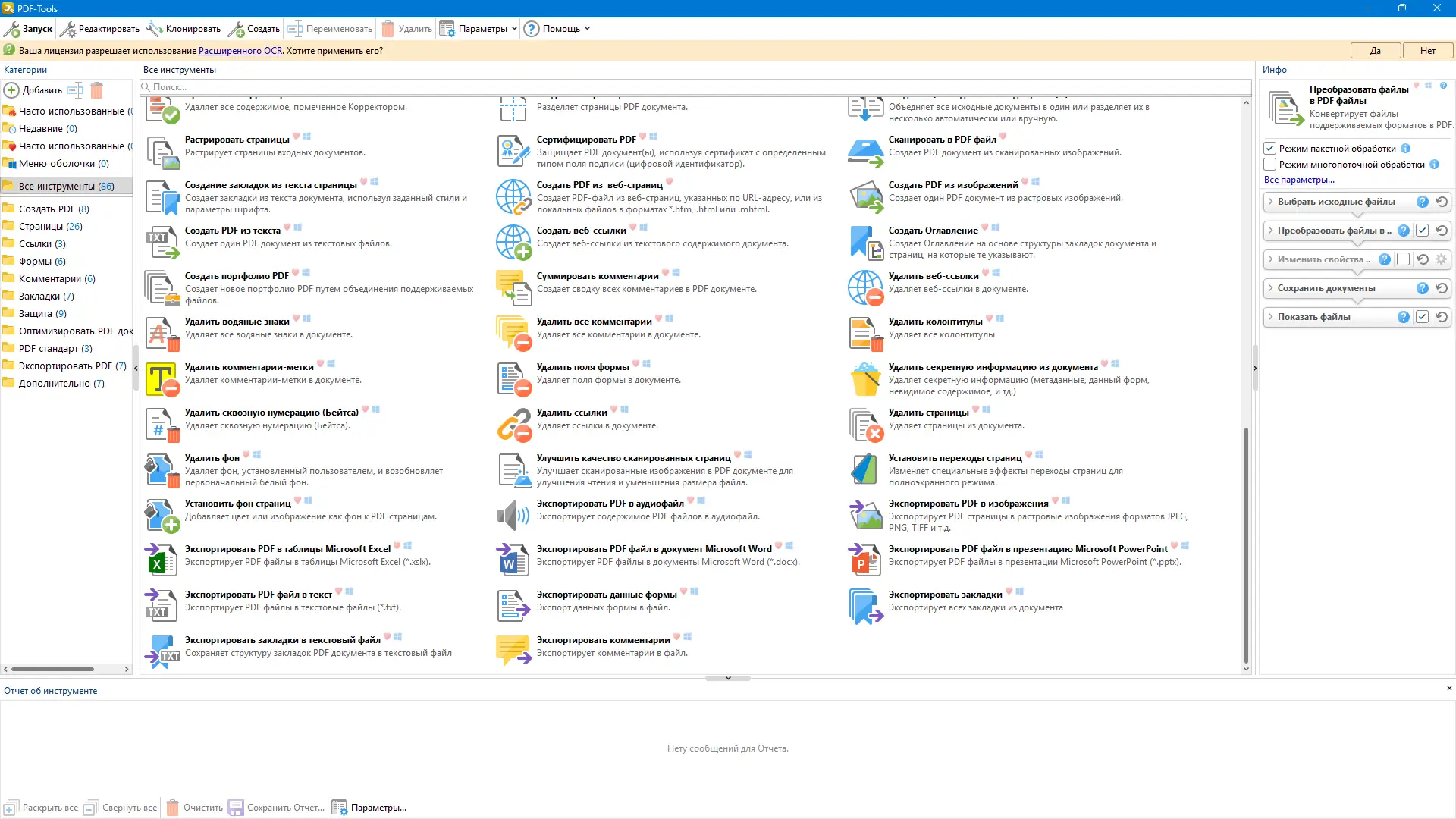 Использование PDF-XChange не требует глубоких технических знаний благодаря интуитивно понятному интерфейсу и логичной структуре меню. Для создания нового PDF-файла можно воспользоваться виртуальным принтером, выбрав его в диалоге печати любой программы. Редактирование документа осуществляется через встроенный редактор, где доступны инструменты для добавления текста, изображений, штампов и аннотаций. Конвертация файлов выполняется через модуль PDF-Tools, который поддерживает пакетную обработку и настраиваемые профили экспорта.