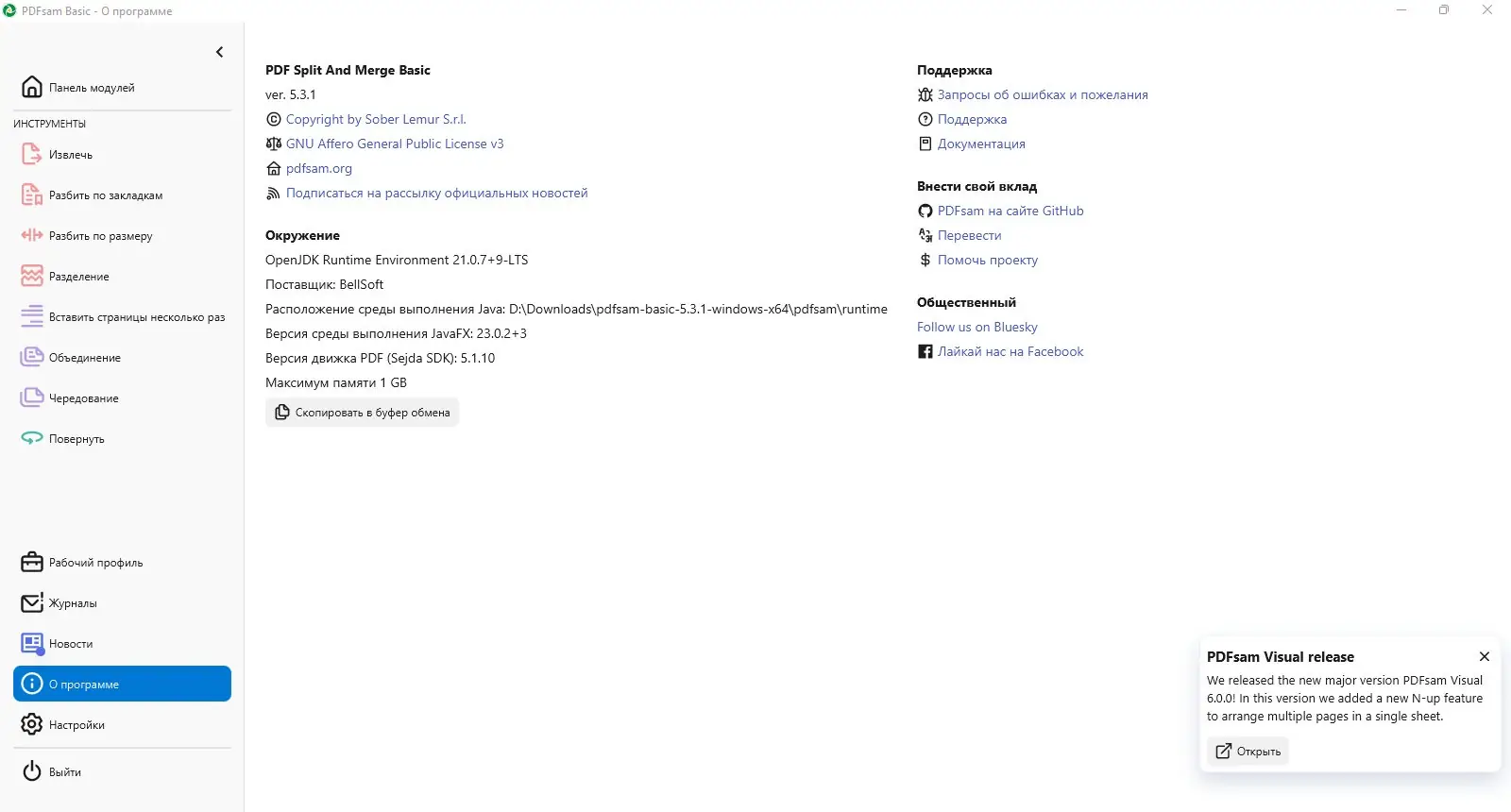 PDFsam сочетает в себе простоту интерфейса и широкие возможности редактирования документов. Программа активно развивается, поддерживает современные стандарты и регулярно обновляется. Среди ключевых улучшений — переход на JDK 21 LTS и обновление Sejda SDK, что повысило стабильность и производительность. Также добавлены системные параметры для настройки версии PDF по умолчанию, что удобно в корпоративной среде.