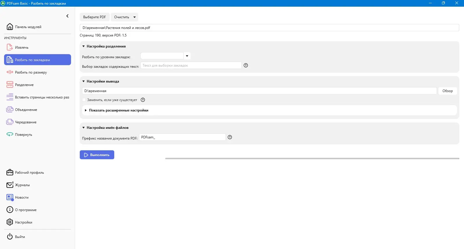 Интерфейс программы разделён на модули, каждый из которых отвечает за определённую операцию: разделение, слияние, поворот, извлечение и другие. Пользователь выбирает нужный режим, добавляет файлы через проводник или перетаскиванием, настраивает параметры обработки и запускает выполнение. Результат сохраняется в указанную папку с возможностью выбора версии PDF и уровня совместимости.