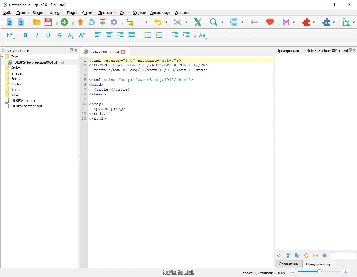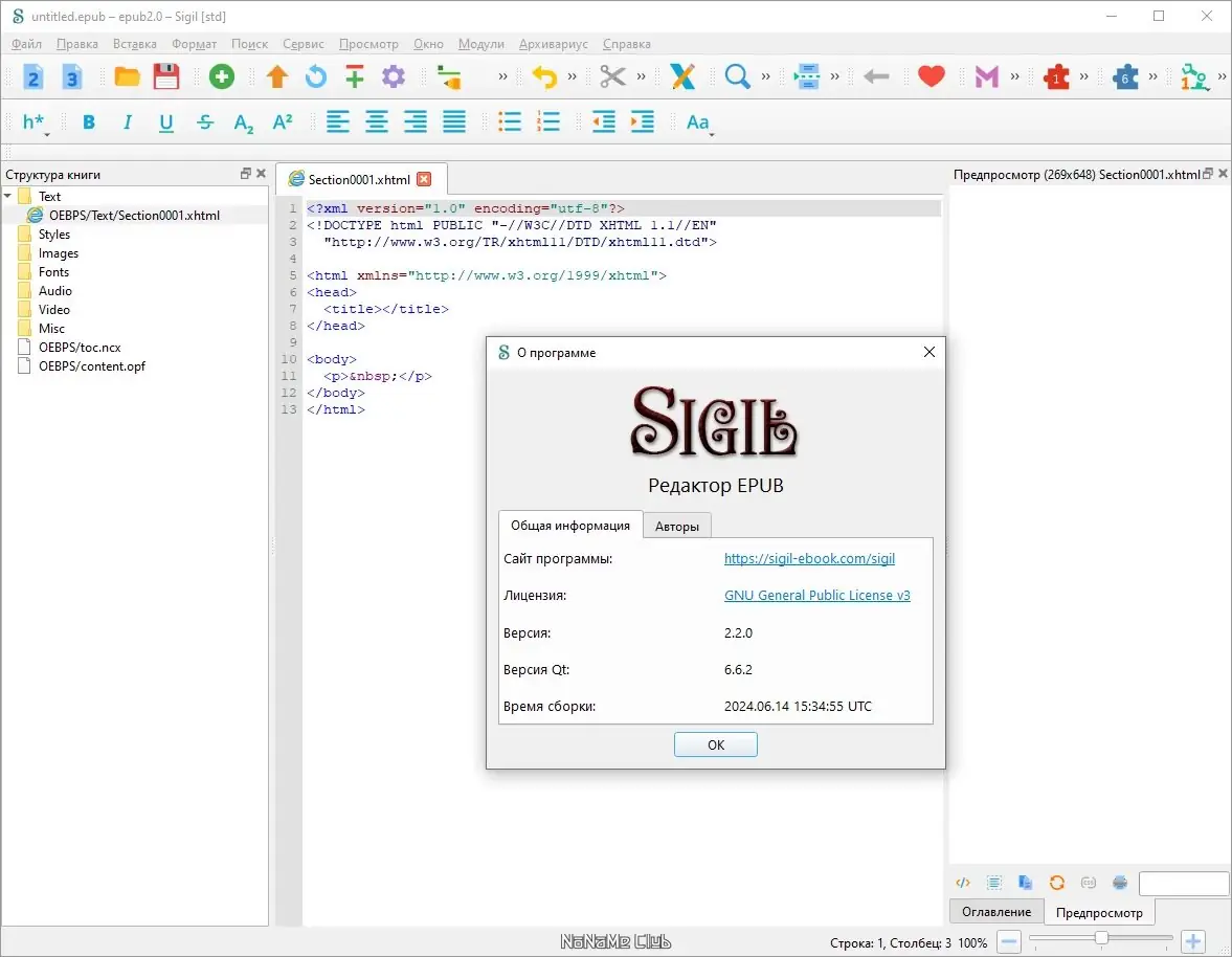 Sigil — это многофункциональный редактор электронных книг в формате EPUB, предназначенный для создания, редактирования и настройки цифровых изданий с высокой степенью кастомизации. Программа поддерживает работу с HTML, XHTML и TXT, позволяет встраивать изображения и видео, управлять структурой документа и оформлением. Интерфейс ориентирован как на новичков, так и на опытных пользователей, стремящихся к точному контролю над контентом.