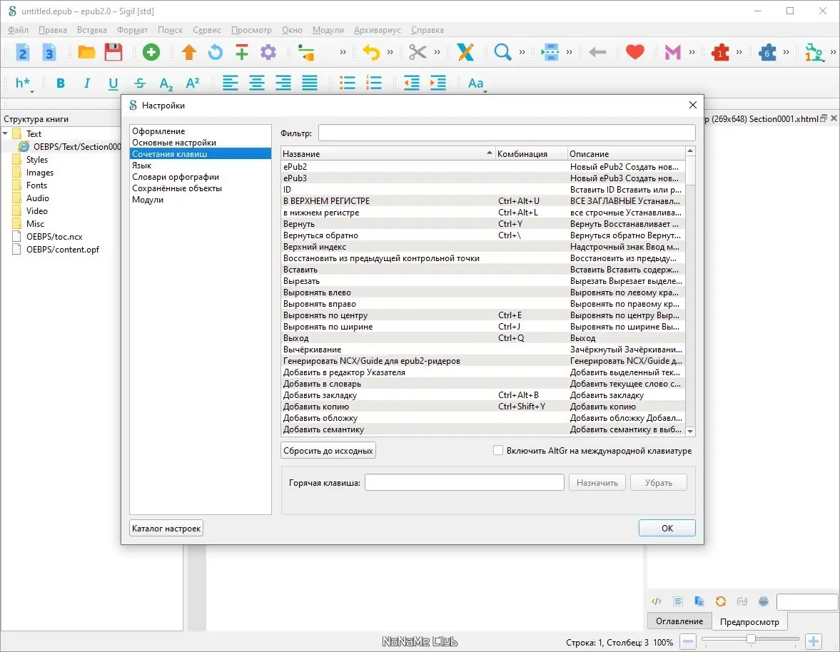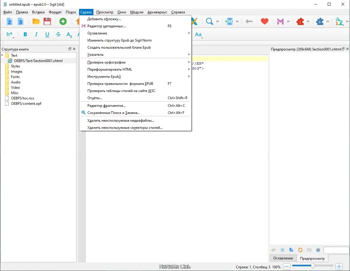 Работа с Sigil начинается с создания нового проекта или открытия существующего EPUB-файла. В центральной области редактора отображается содержимое книги, которое можно изменять в визуальном режиме или напрямую через HTML-код. Через боковую панель доступна навигация по структуре книги, управление вложенными файлами и ресурсами. Пользователь может вставлять ссылки, изображения, видео, форматировать абзацы, настраивать стили и проверять результат в режиме предпросмотра. Редактор метаданных позволяет указать автора, название, серию и другую информацию, важную для каталогизации.