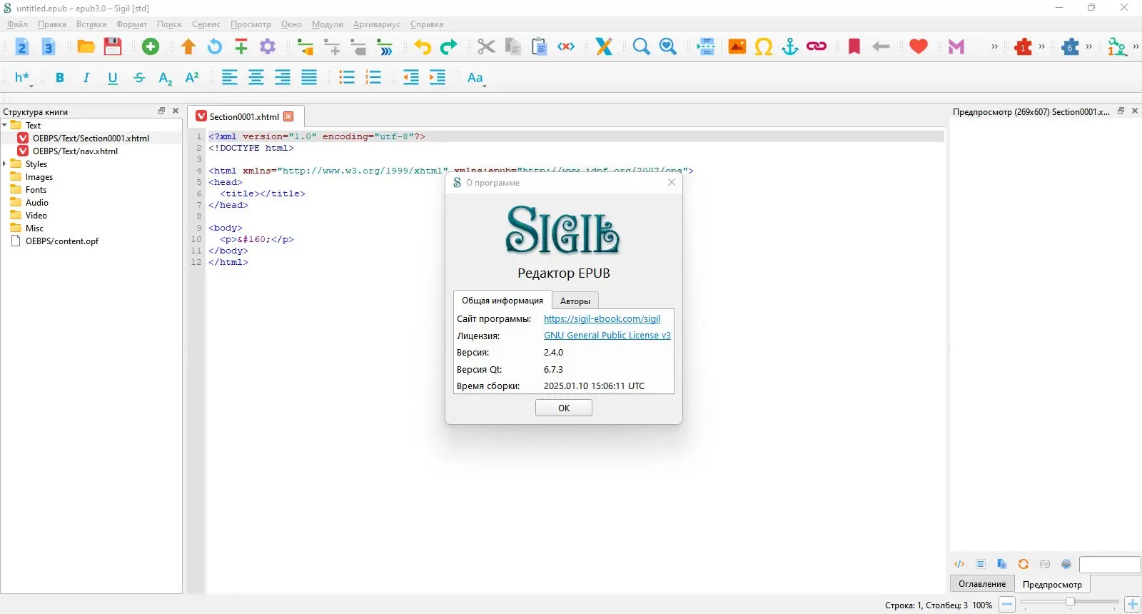 Sigil — это многофункциональный редактор электронных книг в формате EPUB, предназначенный для создания, редактирования и настройки цифровых изданий с высокой степенью кастомизации. Программа поддерживает работу с HTML, XHTML и TXT, позволяет вставлять изображения и видео, форматировать текст и управлять структурой документа. Инструмент подходит как для новичков, так и для профессионалов, работающих с цифровым контентом.