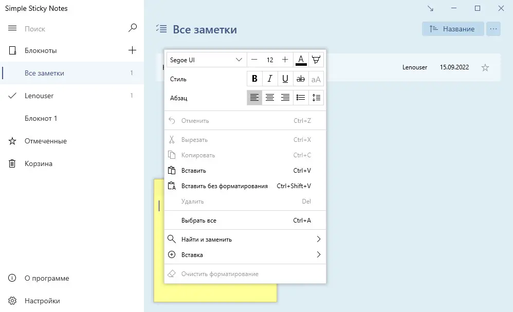 Программа предлагает интуитивно понятный интерфейс, в котором каждый пользователь сразу чувствует себя уверенно. Создание новой заметки занимает одно нажатие, а настройка цвета фона, шрифта, прозрачности и размера происходит в пару кликов. Интерфейс не перегружен, но при этом предоставляет доступ к расширенным функциям, таким как экспорт в .txt и .rtf, распечатка и вставка специальных символов.
