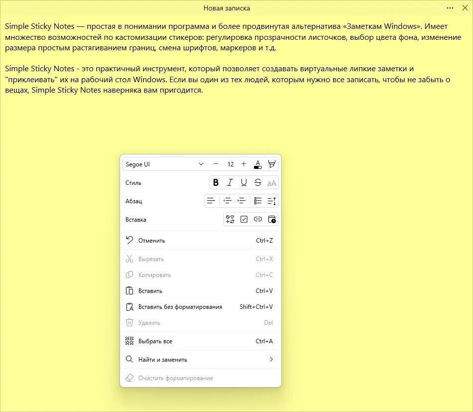 Программа предоставляет пользователям гибкую систему управления заметками, позволяя адаптировать их под индивидуальные предпочтения. Каждый стикер можно настроить по цвету фона, шрифту, прозрачности и размеру, растягивая его границы. Поддержка форматирования текста и вставка специальных символов делают запись информации более удобной и наглядной.