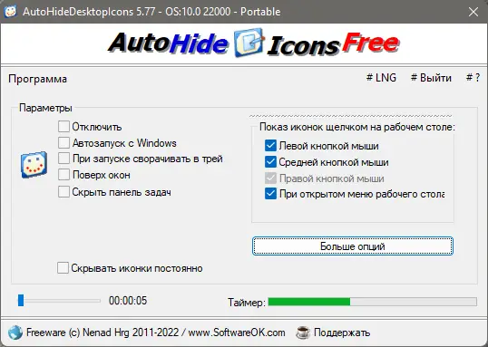 AutoHideDesktopIcons — это компактная утилита для управления видимостью иконок на рабочем столе и панели задач с помощью простых действий мышью или по таймеру. Программа помогает быстро скрывать и возвращать элементы интерфейса, освобождая пространство для работы или просмотра обоев. Решение идеально подойдёт тем, кто ценит порядок и визуальную чистоту в операционной системе.