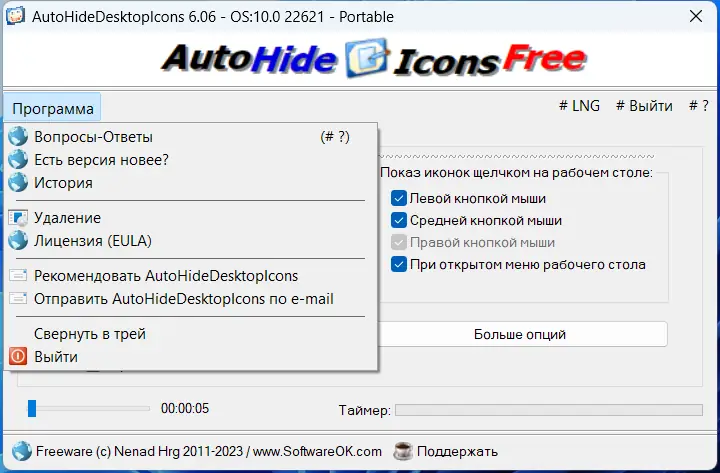 AutoHideDesktopIcons — компактная утилита для автоматического скрытия и отображения иконок на рабочем столе с помощью простого клика мышью или по таймеру. Программа помогает поддерживать порядок в интерфейсе операционной системы, временно убирая визуальный мусор. Идеальное решение для пользователей, ценящих чистоту и минимализм в оформлении рабочего пространства.