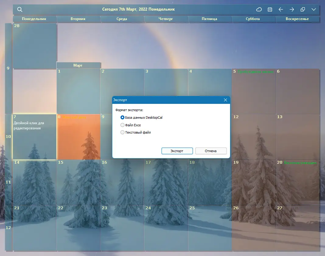 Работа с приложением не требует специальных навыков. После установки календарь автоматически появляется на рабочем столе в виде компактного окна. Двойной клик по дате открывает режим редактирования, где можно добавить задачу, заметку или указать важное событие. Для фиксации элементов интерфейса, например, важной записи, также используется двойной щелчок. Размер окна настраивается простым растягиванием, как обычное окно в среде windows. Все изменения сохраняются автоматически, а синхронизация данных возможна через экспорт в файл и последующий импорт на другом устройстве.