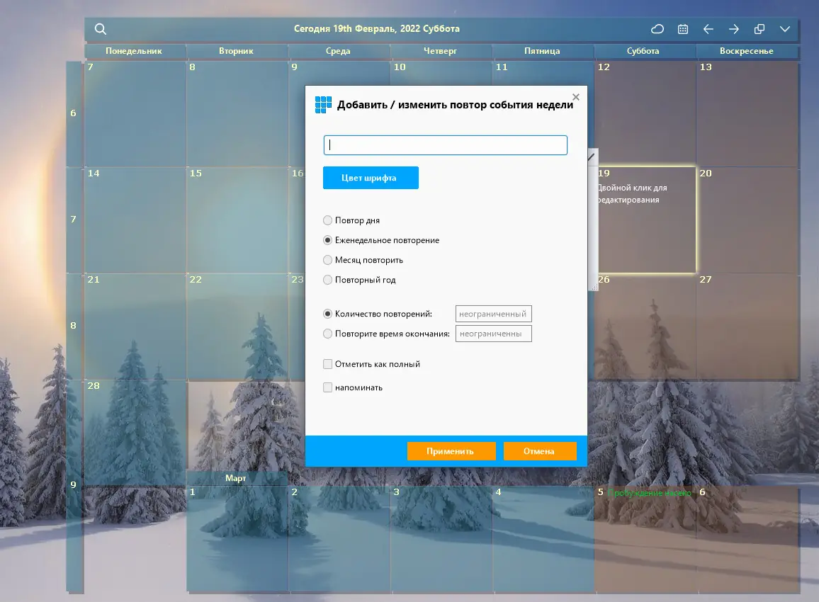 - Фиксация окна календаря на рабочем столе двойным кликом