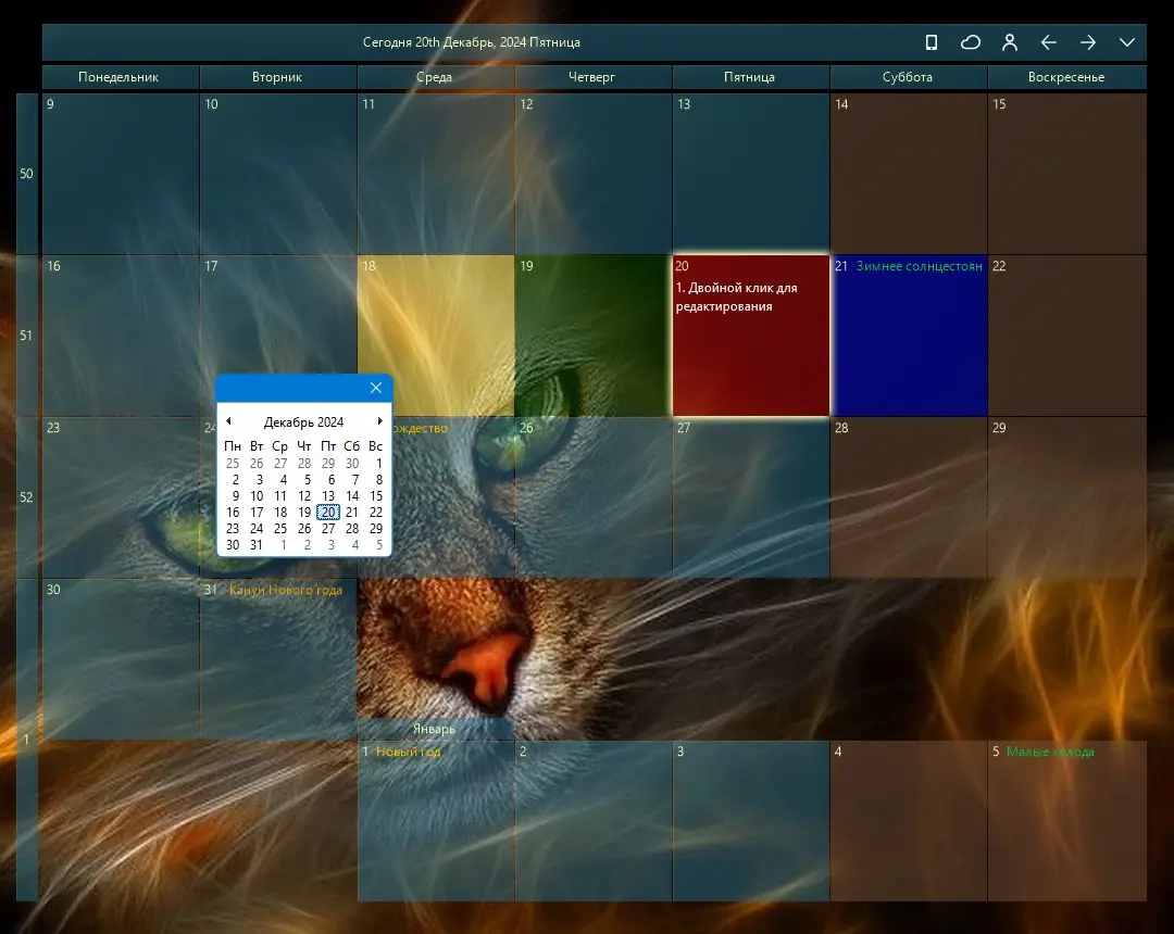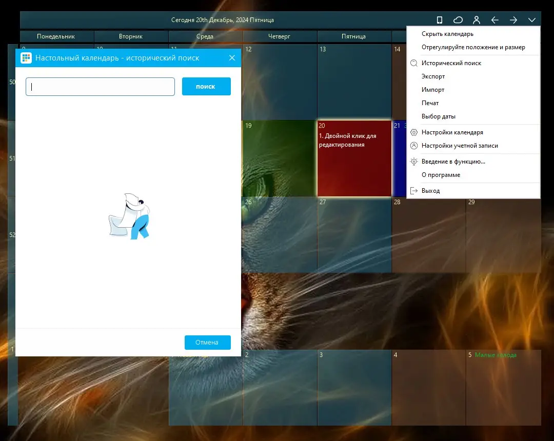 Использование Desktop Calendar не требует специальных знаний. После запуска приложение появляется на рабочем столе в виде компактного окна с текущим месяцем. Двойной щелчок по любой дате открывает окно редактирования, где можно добавить новую задачу, заметку или напоминание. Для фиксации важного элемента на экране также используется двойной клик, который закрепляет запись. Настройки масштаба и положения окна выполняются перетаскиванием и растягиванием границ, что делает взаимодействие с календарём максимально естественным. Данные можно экспортировать в файл для переноса на другое устройство или импортировать из резервной копии, что особенно удобно при смене компьютера.