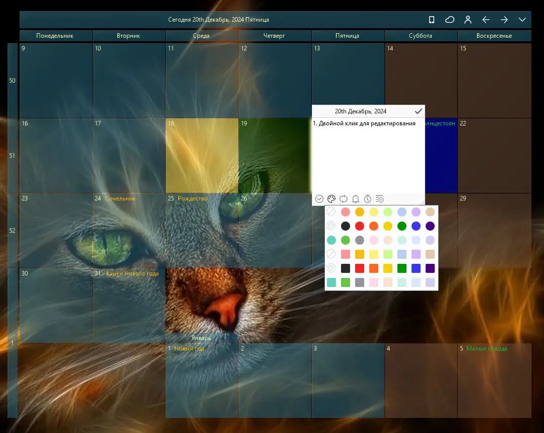 Desktop Calendar — это бесплатное приложение для операционных систем Windows, которое превращает стандартный календарь в функциональный инструмент планирования. Программа сочетает в себе лаконичный дизайн и расширенные возможности, позволяя вести список дел, отмечать важные события, создавать заметки и визуально выделять значимые даты. Установка не требует сложных настроек, а интерфейс остаётся интуитивно понятным даже для новичков.