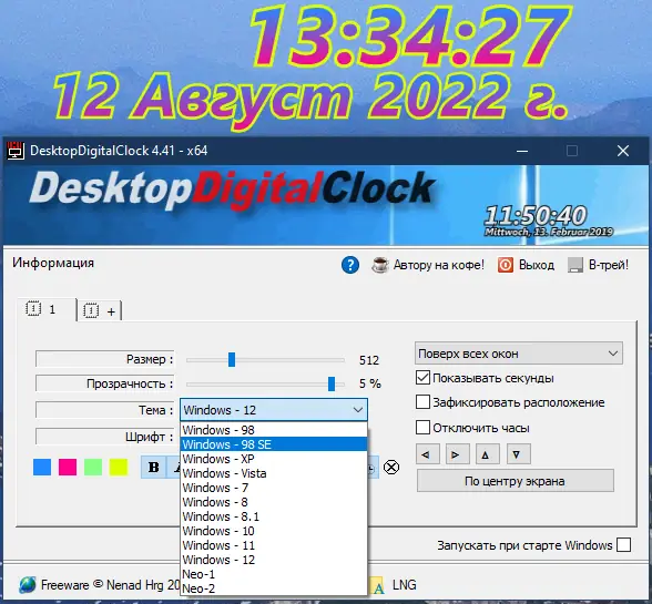 Запуск программы осуществляется двойным кликом по исполняемому файлу, после чего на экране появляются цифровые часы. Управление настройками выполняется через контекстное меню, вызываемое щелчком правой кнопки мыши по циферблату. Здесь можно выбрать нужную тему, изменить шрифт, отрегулировать прозрачность и размер отображаемого времени, а также задать фиксированное положение на экране. Для смены языка интерфейса достаточно перейти в раздел LNG и выбрать Russian. Благодаря портативной архитектуре, приложение можно запускать с флеш-накопителя без необходимости установки на жёсткий диск.